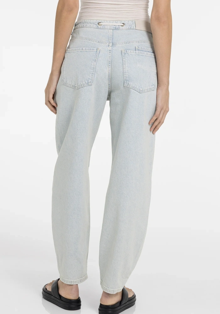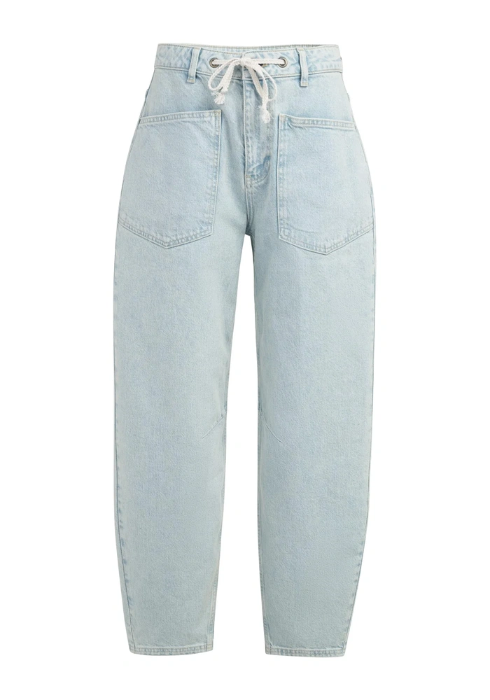 Comfortabele worker jeans van Yaya in gekleurde denim met losse pasvorm en taps toelopende pijpen. Voorzien van grote opgestikte voor- en achterzakken en een opvallende koordsluiting in de taille voor een casual touch.