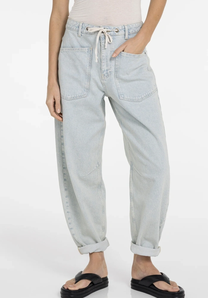 Comfortabele worker jeans van Yaya in gekleurde denim met losse pasvorm en taps toelopende pijpen. Voorzien van grote opgestikte voor- en achterzakken en een opvallende koordsluiting in de taille voor een casual touch.