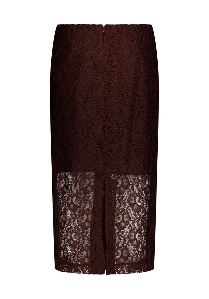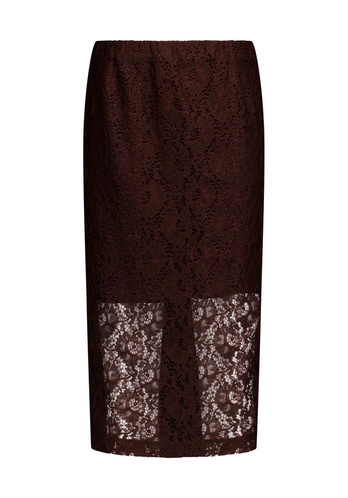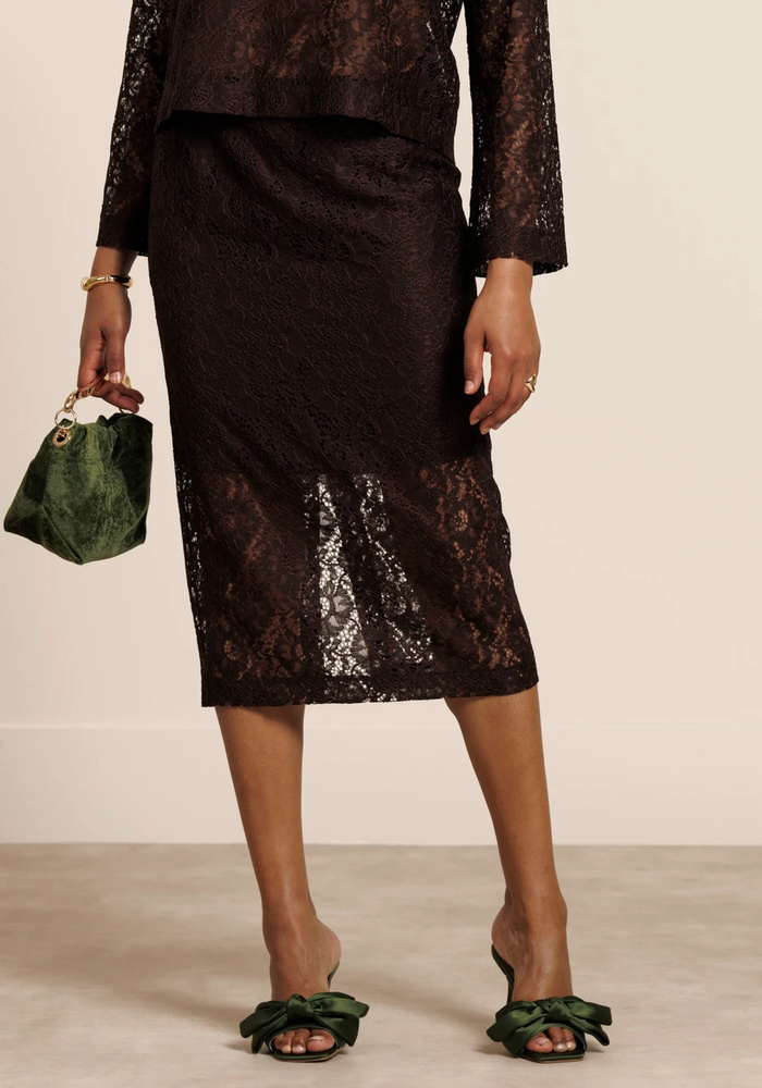 Studio Anneloes Alissa Lace Skirt is een elegante midi rok in de diepe kleur Espresso met een verfijnde kanten afwerking. De split en elastische tailleband zorgen voor een comfortabele pasvorm en optimale bewegingsvrijheid.