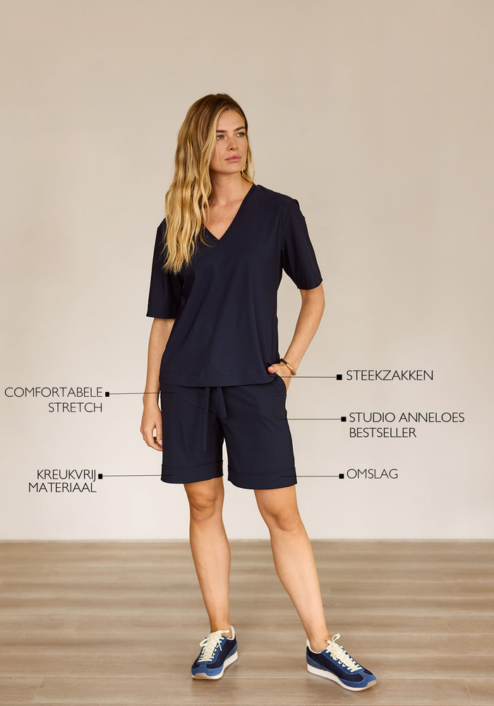 De City Bermuda van Studio Anneloes is een stijlvolle must-have voor zonnige dagen. De elegante lengte, de omslag bij de pijpen en de comfortabele tailleband met rijgkoord geven deze short een moderne, verzorgde uitstraling. Gemaakt van stevige Heavy Travelstof, biedt hij een mooie pasvorm en optimaal draagcomfort, de hele dag door.