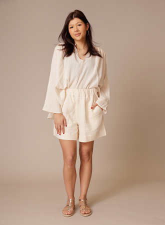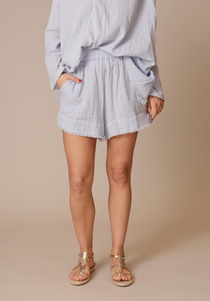 De Moby Shorts Wrinkled Cotton van Sea Me Happy zijn comfortabele shorts met een elastische tailleband. Combineer ze met de bijpassende blouse voor een complete en stijlvolle look.