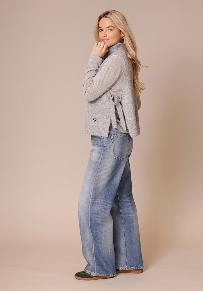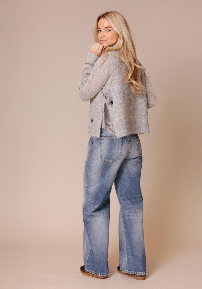 Mouwloze Summum spencer van zacht garen, met opstaand boordje, striksluiting aan de zijkanten en insectvormige broches als speels detail.