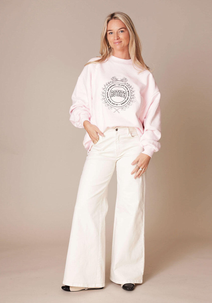 De Heavy Sweater Crewneck van Rotate combineert comfort met gedurfde eenvoud. Hij heeft een oversized silhouet, verlaagde schouders, geribbelde randen en een groot ROTATE varsity-borduursel op de borst. Een zachte basic in een frisse seizoenskleur.