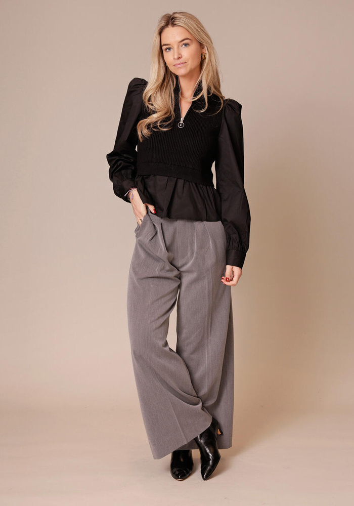 Dit is een zwarte dames top van Co'couture met een stijlvolle mix van materialen. Het bovenstuk is geribbeld breiwerk met een hoge kraag en een halve rits met ringdetail aan de voorkant. De lange ballonmouwen en het losvallende peplum-effect onderaan geven de top een vrouwelijke en moderne uitstraling.