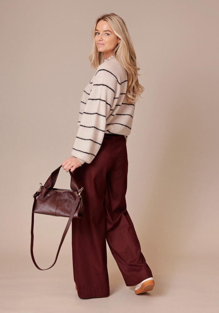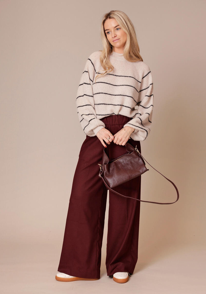 LARELYA is een zachtvallende gebreide trui met raglanmouwen en een compacte, staande kraag. De ballonmouwen en brede boorden creëren een volumineus, verkort silhouet. Gemaakt van een luxe suri-alpaca mix, voelt de trui zijdezacht aan, valt soepel en heeft een subtiele glans voor tijdloze elegantie en warmte.