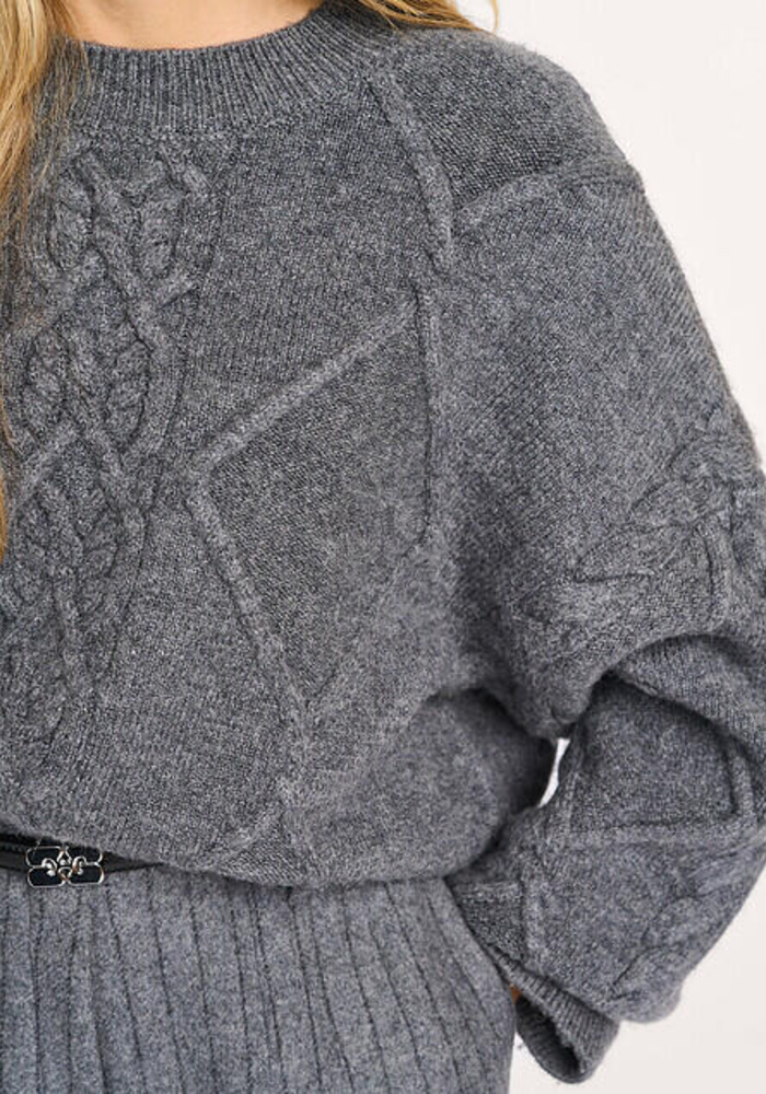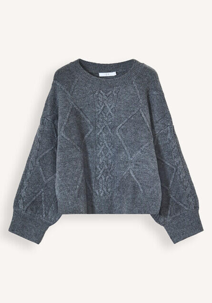 De IRO - Thea sweater in dark grey is een tijdloze trui met een eigentijdse twist. Het kabelgebreide patroon en de relaxte pasvorm geven de knit een luxe uitstraling, terwijl de zachte wolmix zorgt voor ultiem comfort en warmte. Perfect om zowel casual te dragen met denim als chic te combineren met een rok of pantalon.