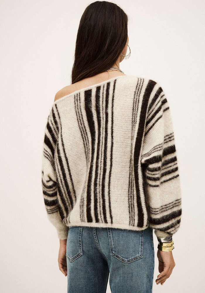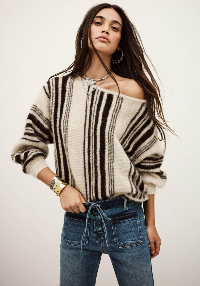 De Suela pull van Ba&sh is een oversized trui met een korte pasvorm. De trui heeft lange mouwen en kan ook off-shoulder gedragen worden.