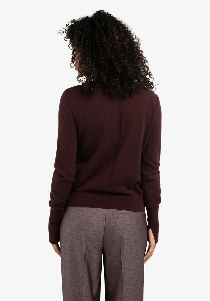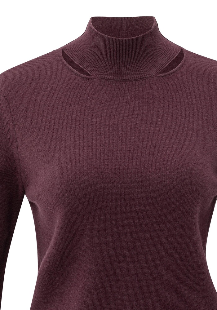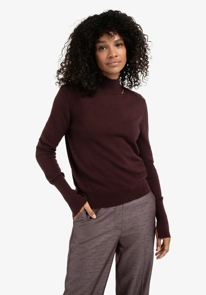 Fijngebreide trui van een zachte wolmix met een opstaande hals en elegante uitsnede. Voorzien van lange mouwen, geribde boorden met subtiele splitjes en een aangesloten pasvorm. Perfect voor een stijlvolle, comfortabele everyday look.