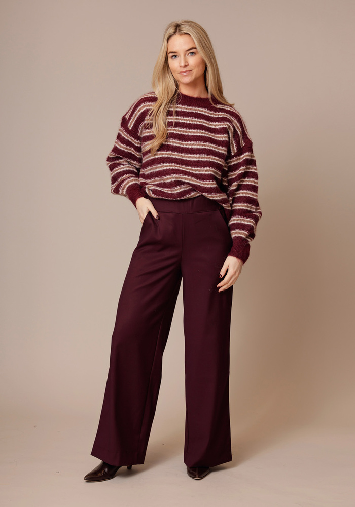 Deze bordeauxrode wollen trui met strepen is helemaal hip, zit superlekker en houdt je goed warm.