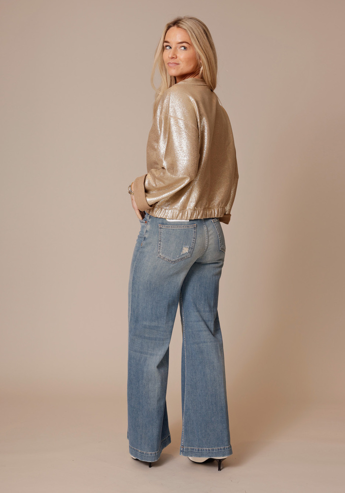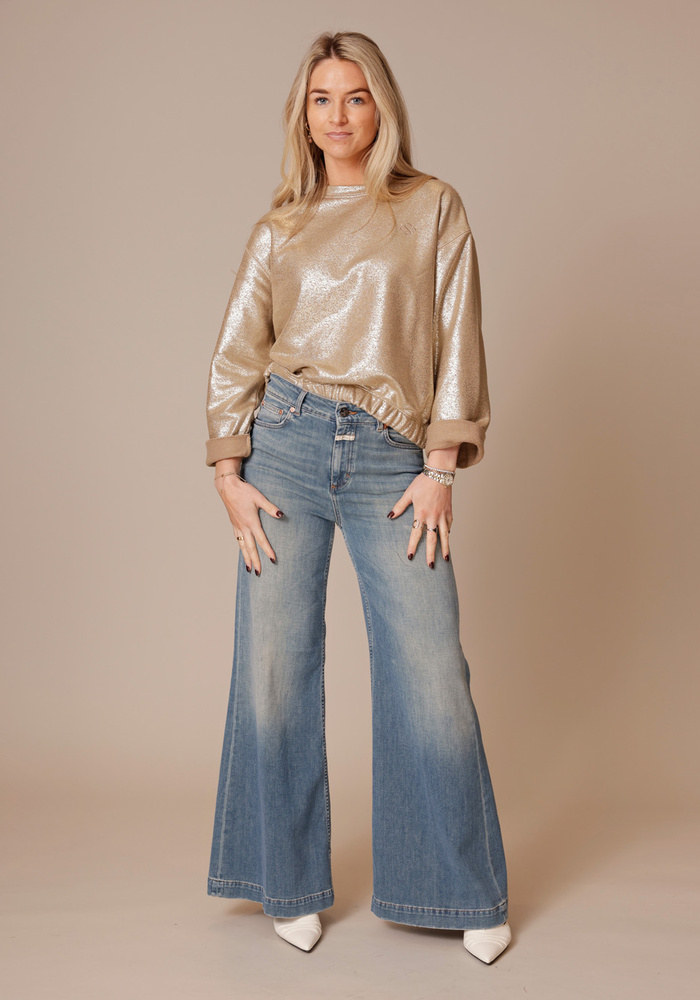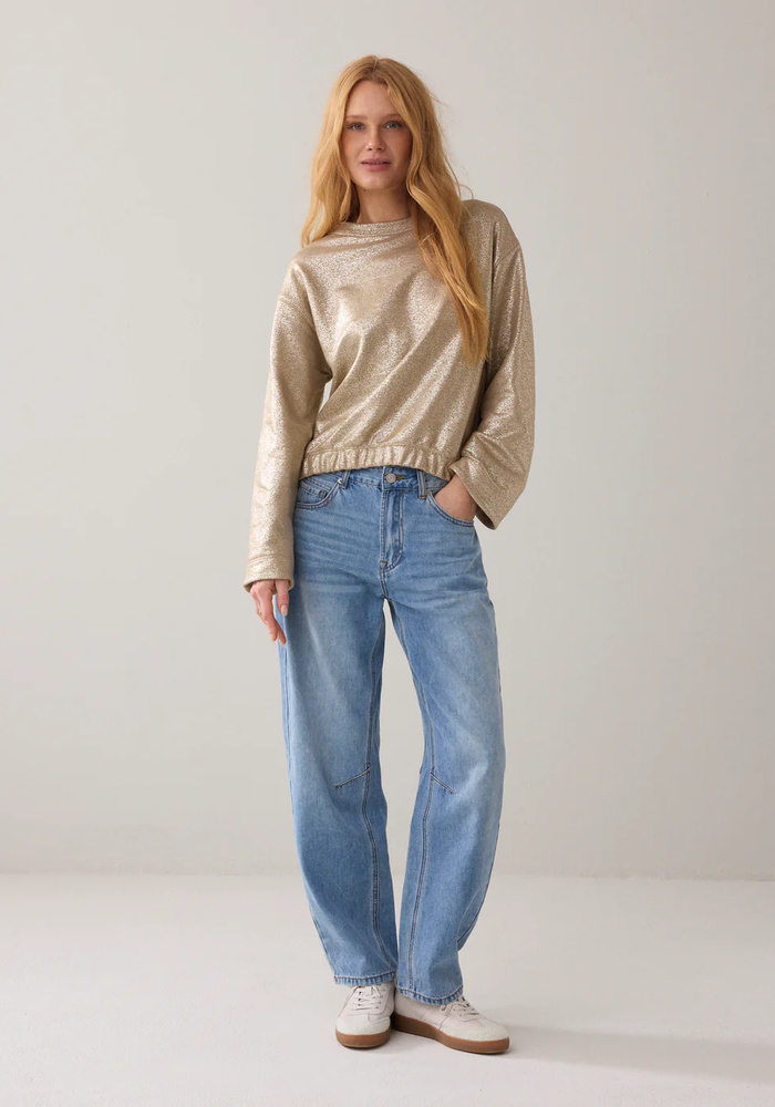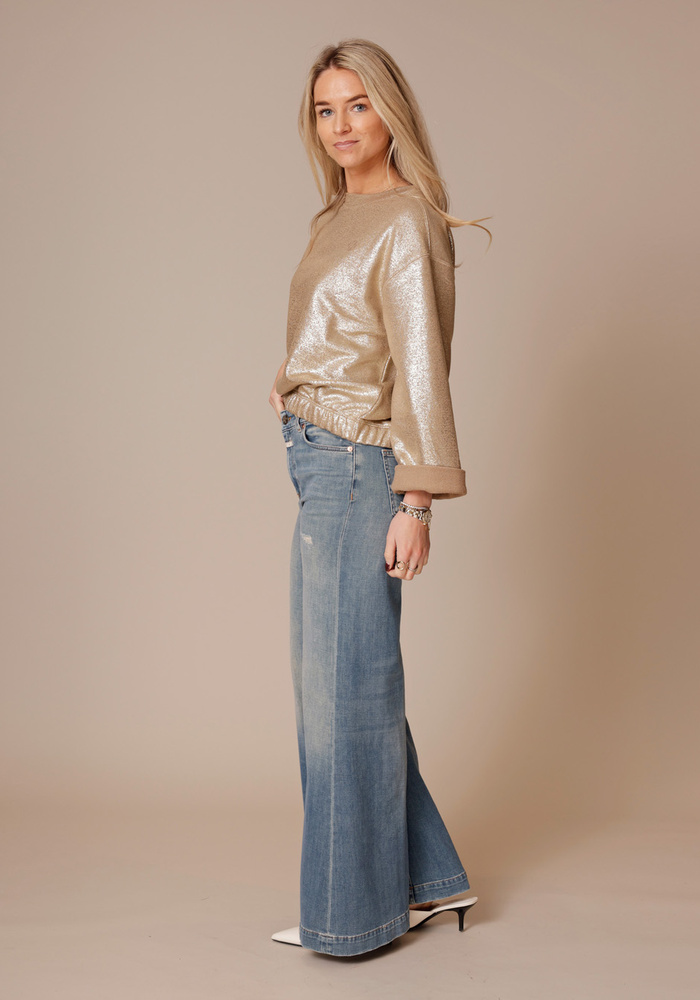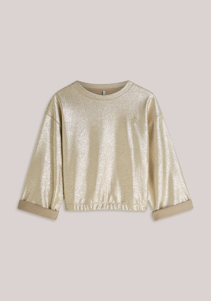 Deze glimmende sweater van Summum met een recht uitlopende kimonomouw. De binnenkant heeft een zachte, teddyachtige structuur. Het model is voorzien van een iets wijdere ronde hals, een tonaal Summum-logo op de voorkant en een licht aangerimpelde onderkant met elastiek.