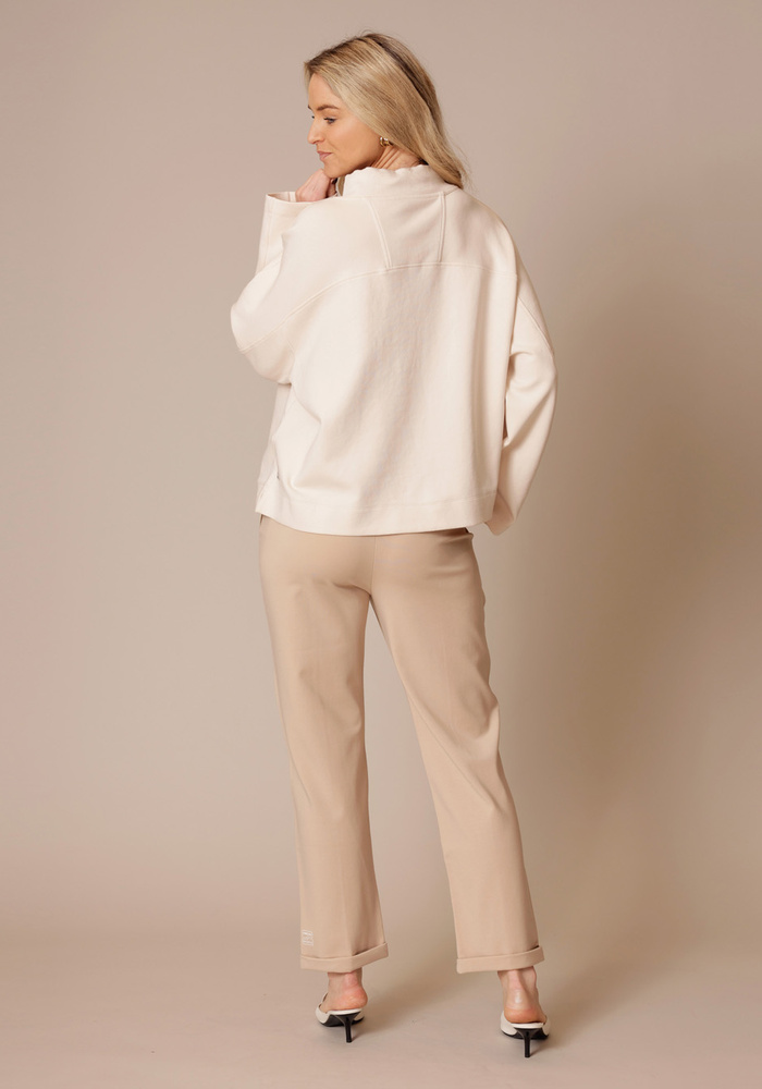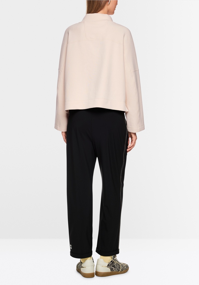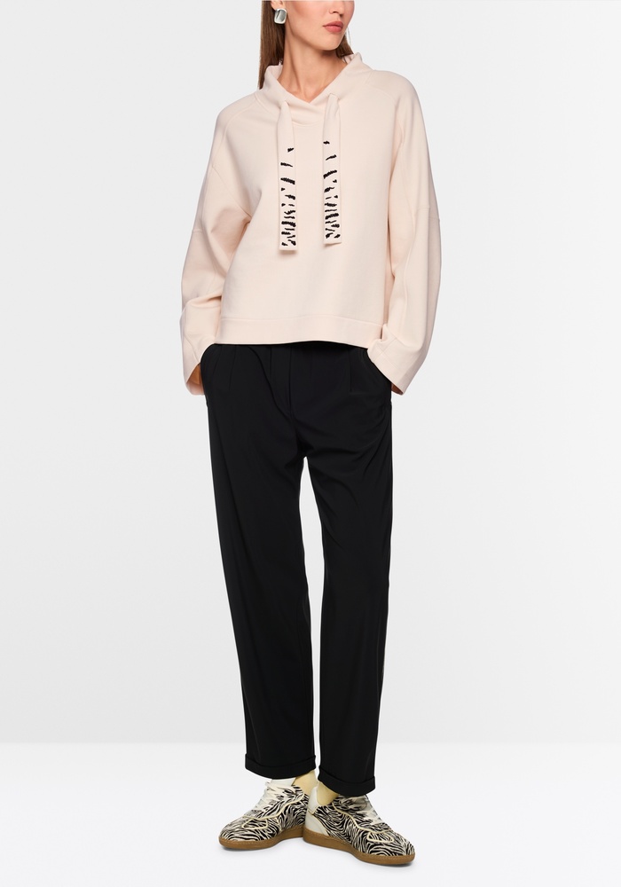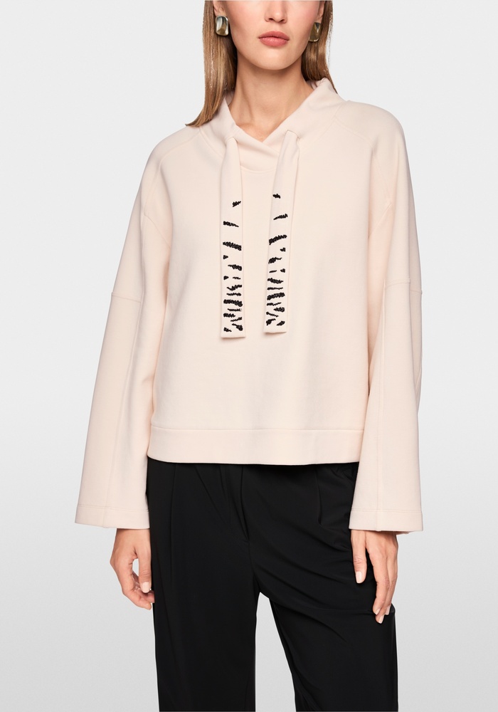 Dit sweatshirt van Marccain heeft een nonchalante, relaxte pasvorm die garant staat voor optimaal draagcomfort. De zachte sweatstof voelt aangenaam aan op de huid. De wijd gesneden mouwen en licht oversized schouders versterken de casual uitstraling. Een trekkoord in de kraag en een band met parelapplicaties geven het geheel een elegante touch.