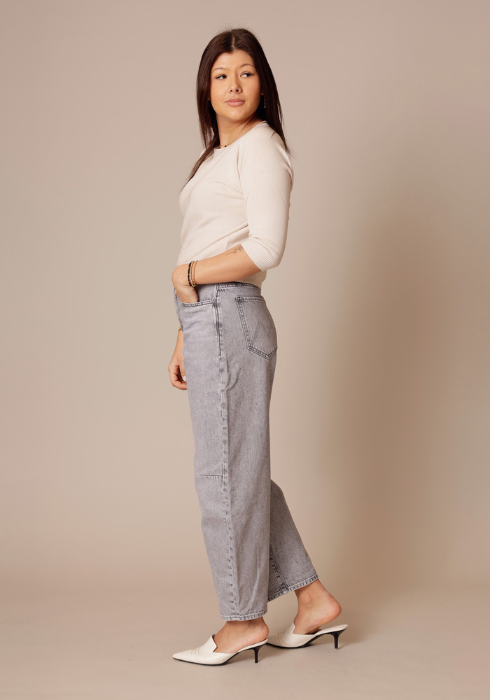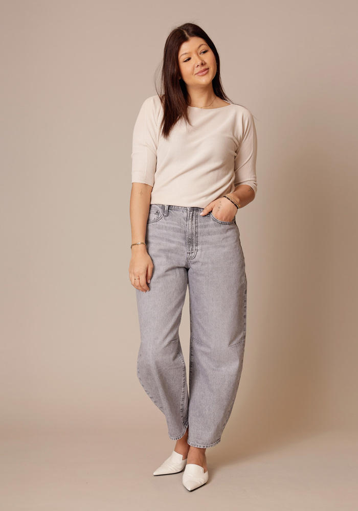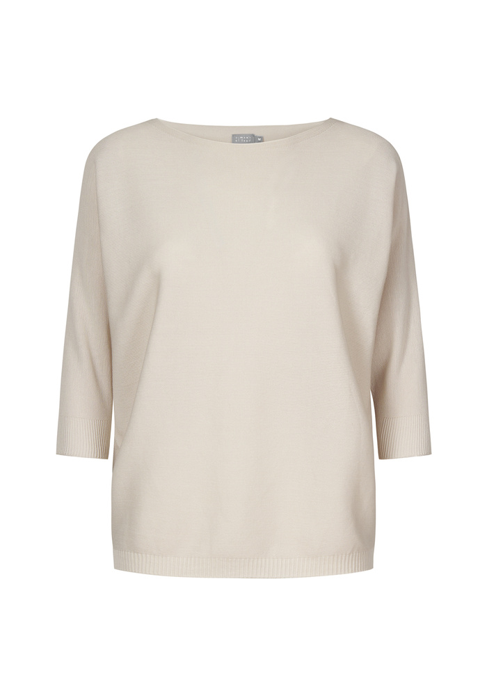 Deze sweater van Noman'sland is een soepelvallend truitje. Het truitje heeft halflange mouwen en een brede ronde hals.