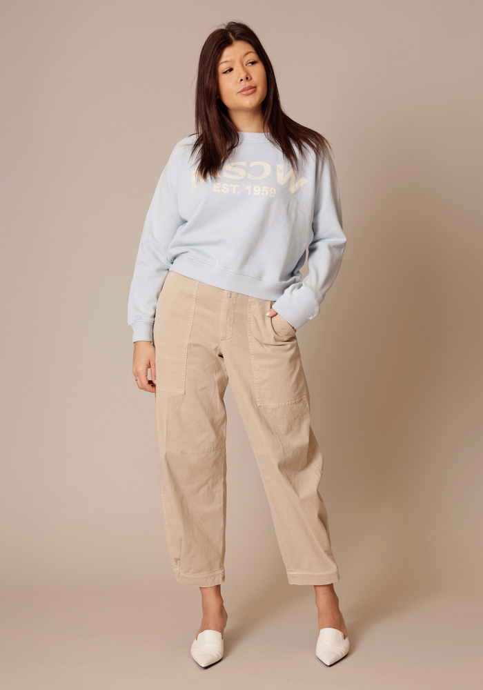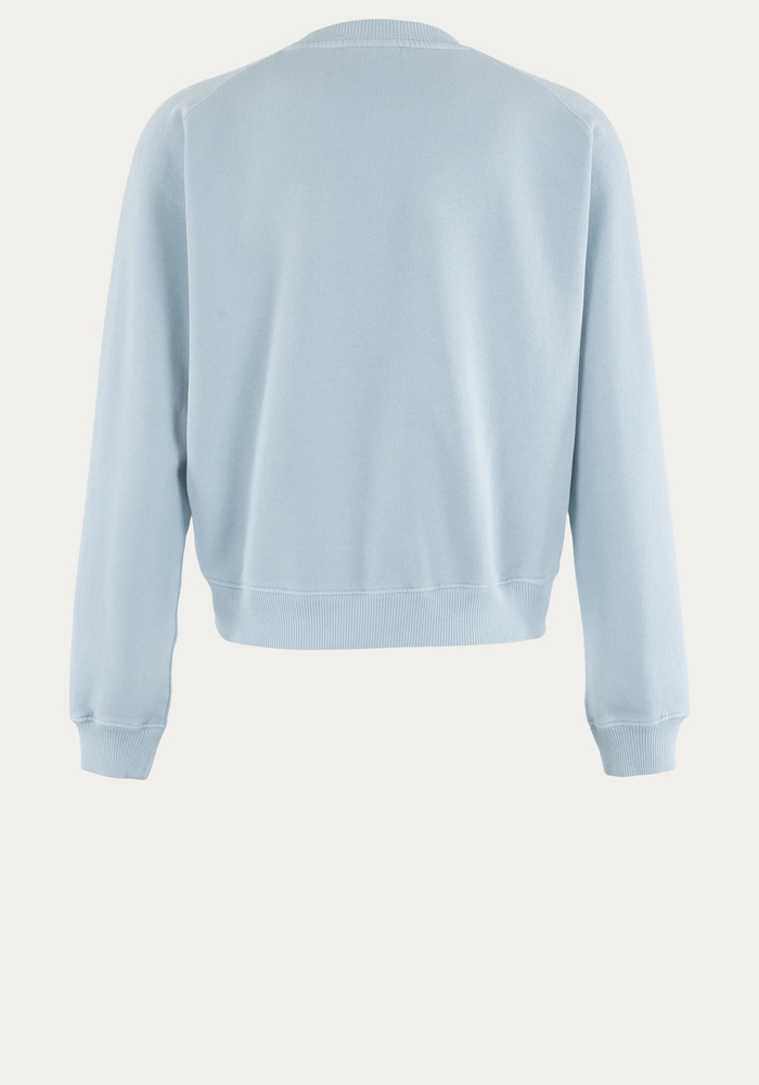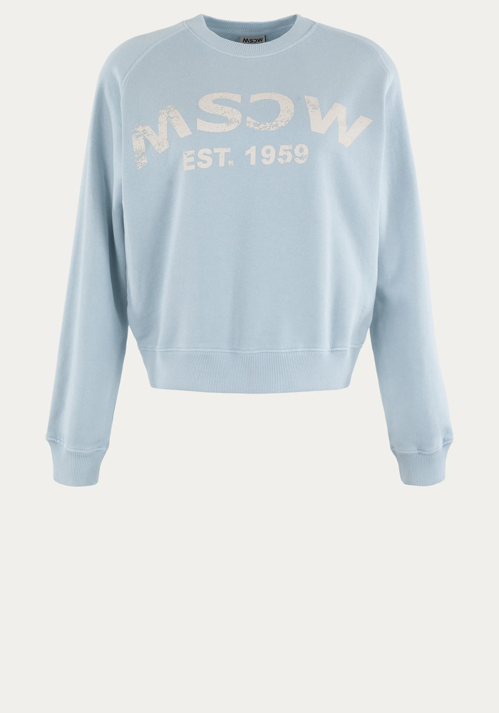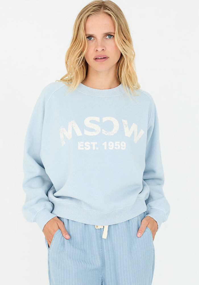 Deze licht denimkleurige sweater van Moscow is gemaakt van 100% katoen en voelt heerlijk zacht aan op de huid. Het model heeft een comfortabele, normale pasvorm met een ronde hals en ribboorden aan de mouwen en zoom. Op de borst is een subtiel logo verwerkt dat zorgt voor een verfijnde uitstraling. Perfect voor koelere zomerdagen of ontspannen momenten. Bovendien eenvoudig te combineren met een jeans of een short.