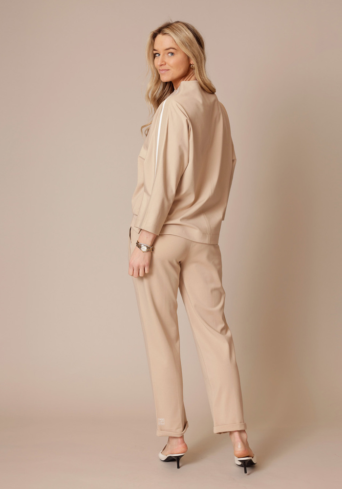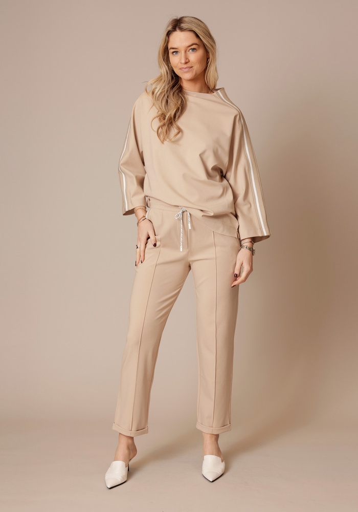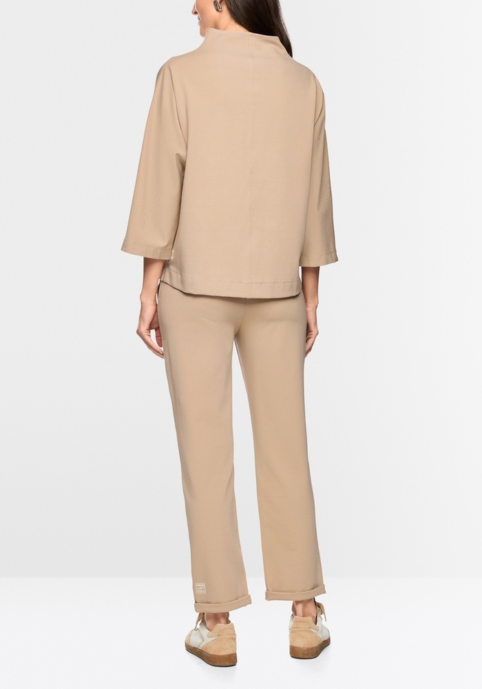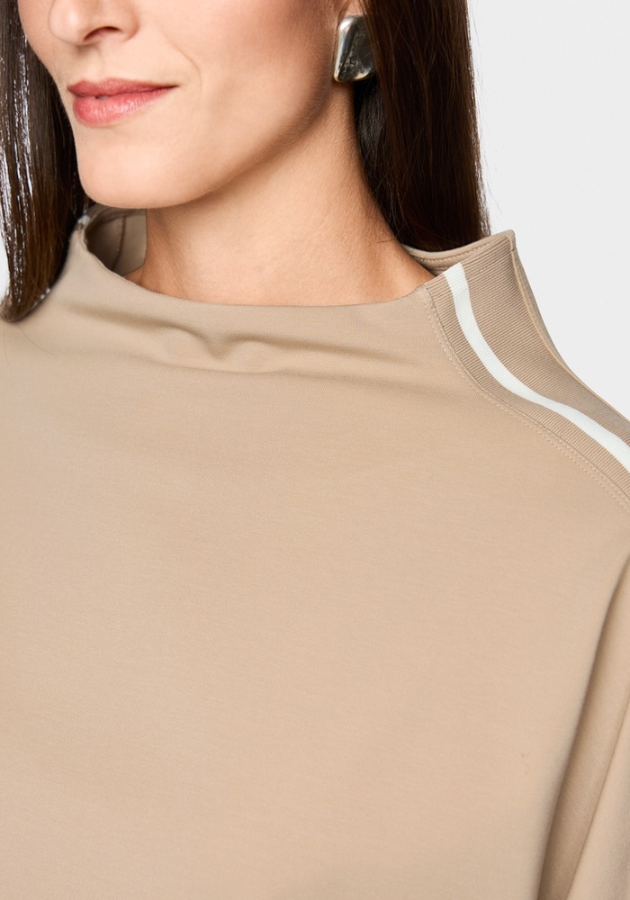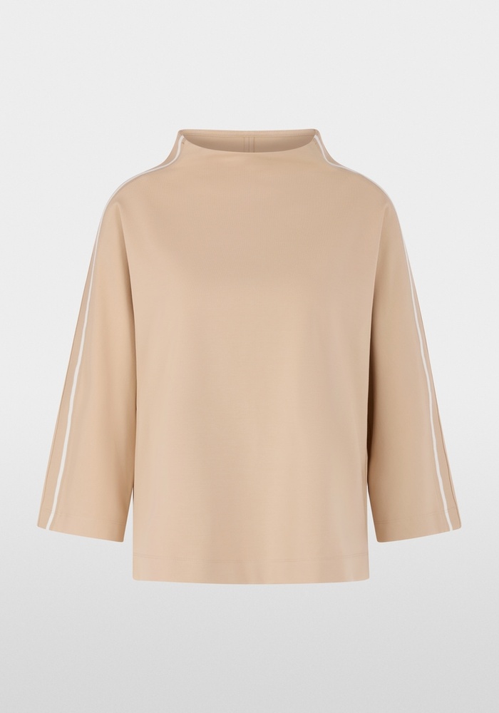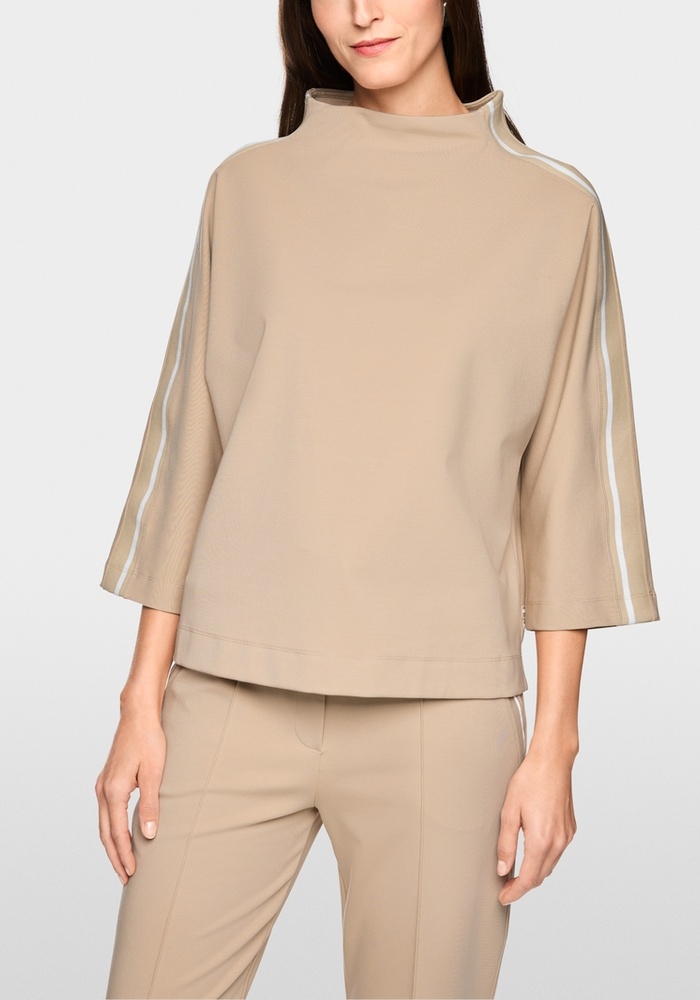 Dit sweatshirt van Marccain is een stijlvol sweatshirt met een opstaande kraag en trendy 3/4-mouwen. De comfortabele, losse fit en de zachte mix van katoen, modal en elastaan zorgen voor een prettig draaggevoel. Fijne streepdetails op de mouwen geven het geheel een sportief-chique uitstraling.