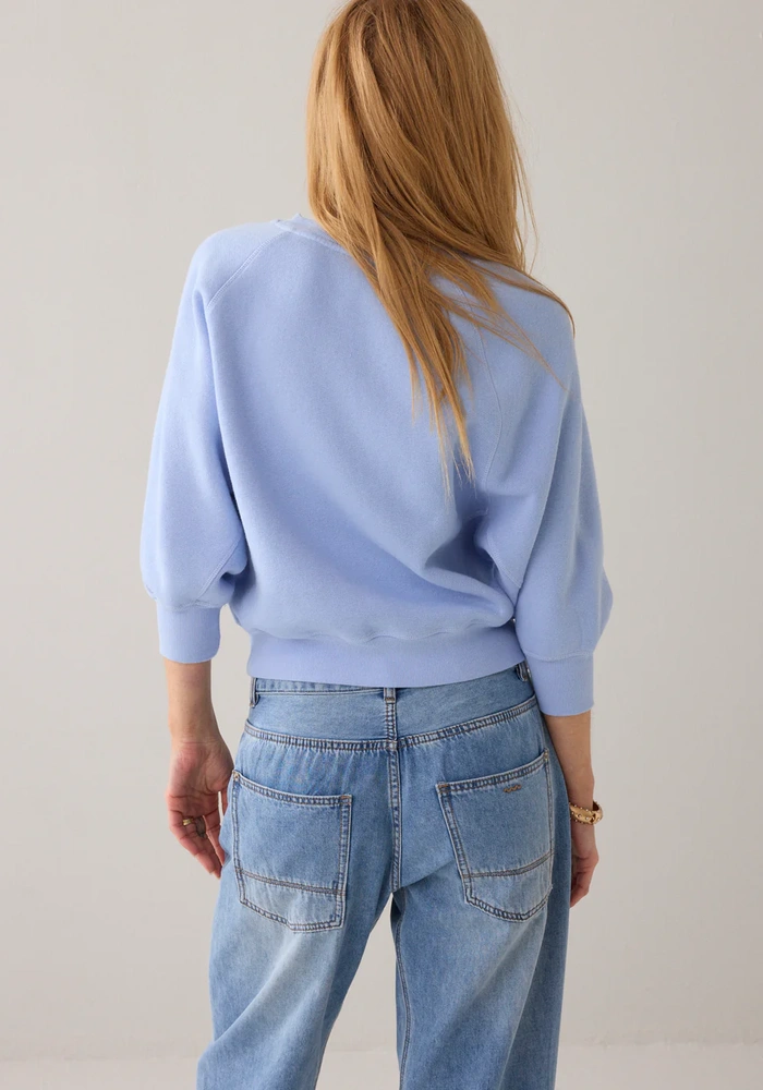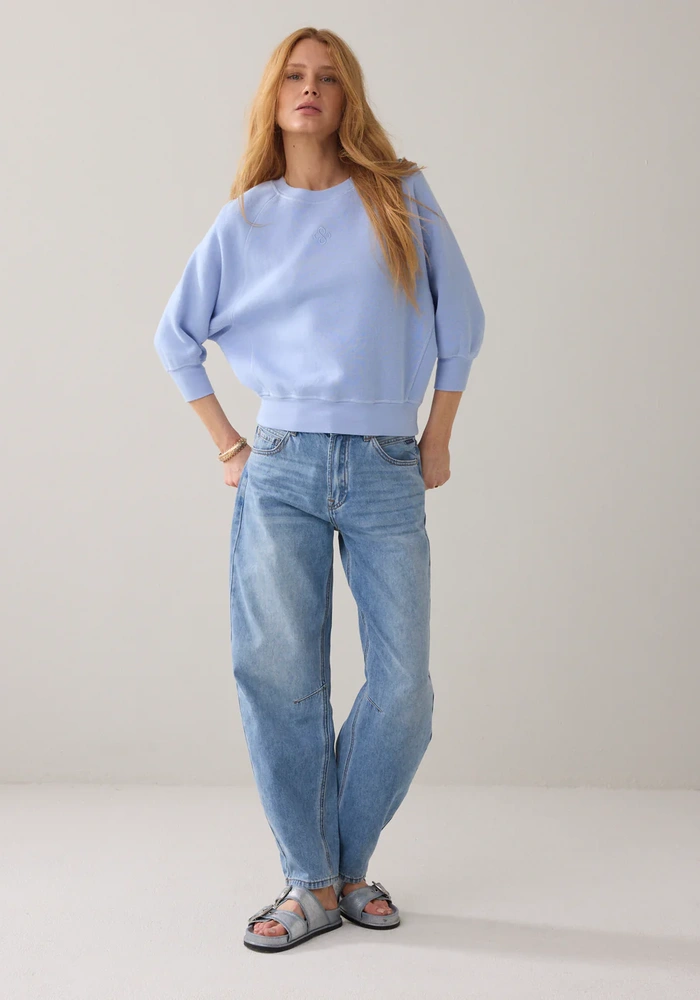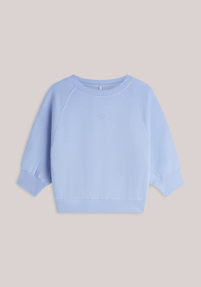 Deze sweater is gemaakt van een zachte stof met een gewassen look en heeft een nonchalante, comfortabele loose fit. De vleermuismouwen op ellebooglengte en de ronde hals met aangesloten ribboorden geven het ontwerp een sportieve uitstraling, terwijl subtiele siernaden zorgen voor extra detail. Een klein geborduurd logo op de voorkant maakt de look compleet, perfect voor een casual en stijlvolle outfit.