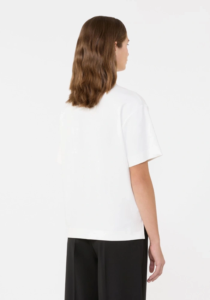 Dit t-shirt van Weekend MaxMara is een basic T-shirt van puur biologisch katoen, uitgevoerd in een zachte jersey met interlock-stiksels en hitte-afgewerkte details. Het model heeft een boxy fit met zijsplitten, een klassieke ronde hals en korte mouwen. De achterkant is iets langer voor een moderne, ontspannen look. Op de achterzijde van de hals staat een subtiel gedrukt logodetail.