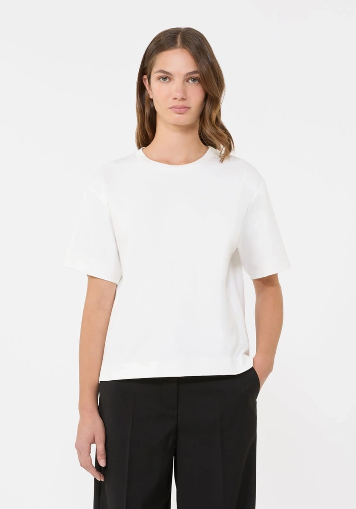 Dit t-shirt van Weekend MaxMara is een basic T-shirt van puur biologisch katoen, uitgevoerd in een zachte jersey met interlock-stiksels en hitte-afgewerkte details. Het model heeft een boxy fit met zijsplitten, een klassieke ronde hals en korte mouwen. De achterkant is iets langer voor een moderne, ontspannen look. Op de achterzijde van de hals staat een subtiel gedrukt logodetail.