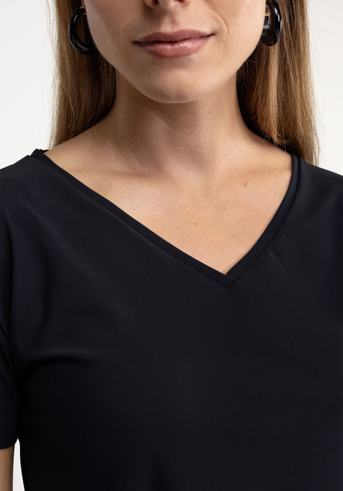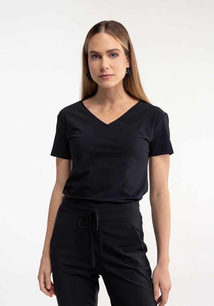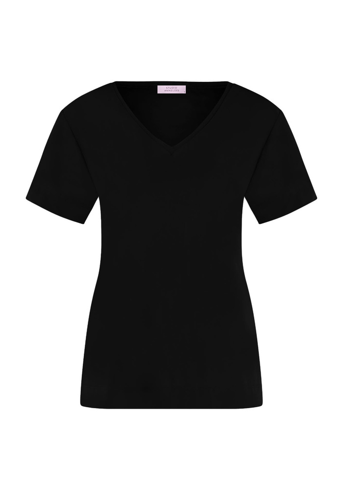 Het Roller shirt van Studio Anneloes is een vrouwelijke basic die zich eindeloos laat combineren. In Dark Blue heeft het shirt een frisse, zachte uitstraling, net zo stijlvol als zwart. De diepe V-hals en soepele pasvorm geven je outfit een elegante uitstraling met een comfortabel draaggevoel.