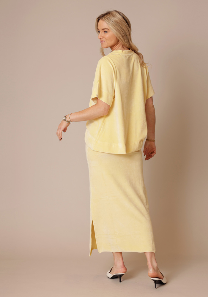 De Valma t-shirt van Love sundaily is lekker wijd en oversized. Gemaakt van velours kwaliteit in een mooie gele kleur.