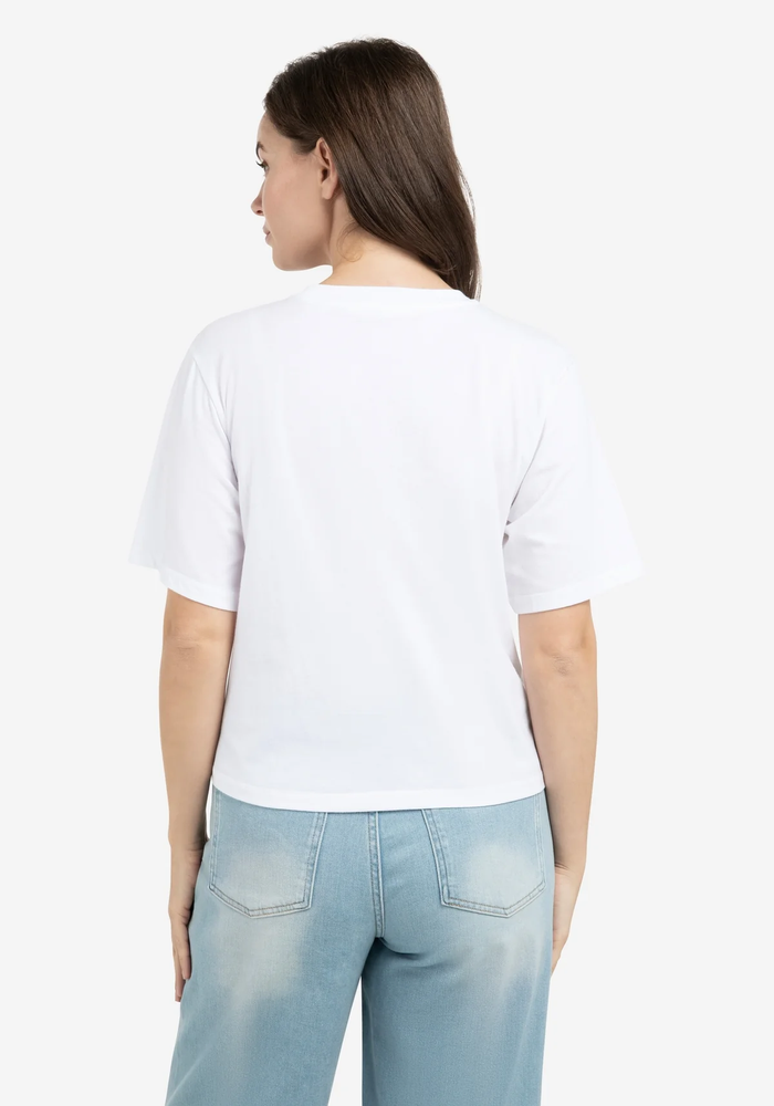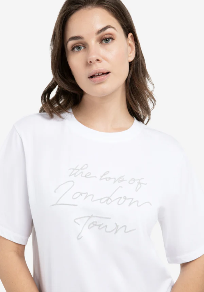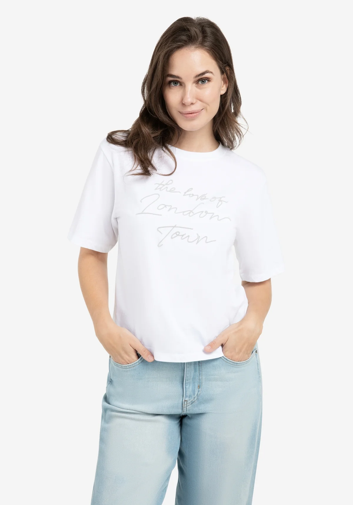 Dit katoenen T-shirt heeft een losse, iets boxy pasvorm en is voorzien van korte, wijde mouwen. Op de borst staat een flockprint met de tekst 'The love of London Town in een zachte finish. De ronde hals en cleane afwerking maken het een casual item met een stijlvolle twist.