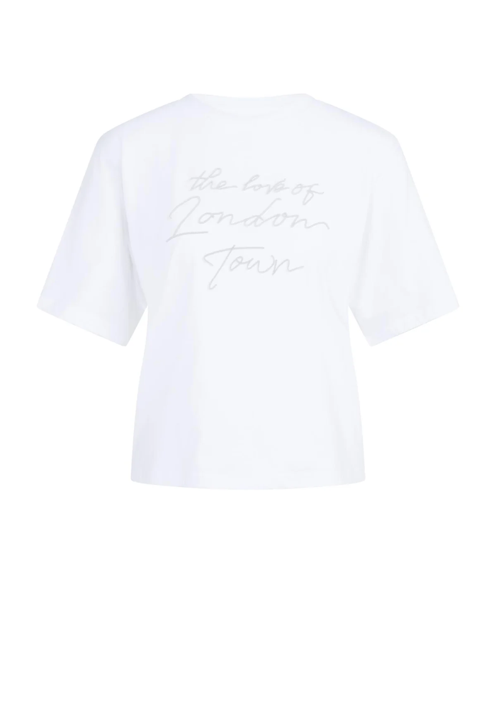 Dit katoenen T-shirt heeft een losse, iets boxy pasvorm en is voorzien van korte, wijde mouwen. Op de borst staat een flockprint met de tekst 'The love of London Town in een zachte finish. De ronde hals en cleane afwerking maken het een casual item met een stijlvolle twist.