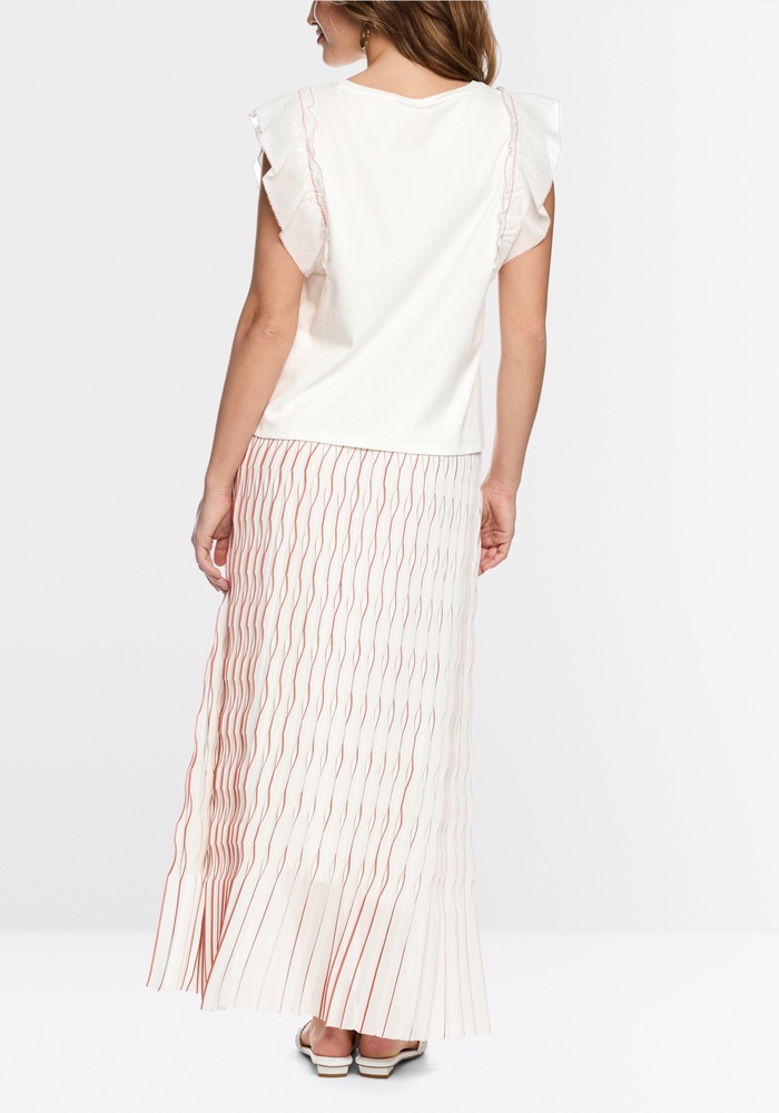 Losvallend, vrouwelijk shirt van stretchkatoen met ronde hals van Marccain. Het t-shirt heeft dubbele vleugelmouwtjes met contrasterende stiksels geven een speels detail.