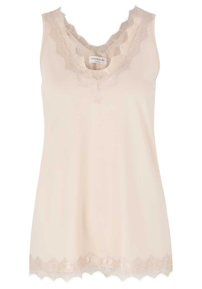 De Billie lace strap v-neck top van Rosemunde is een mouwloze top met kanten details aan de hals. De top heeft een v-hals.