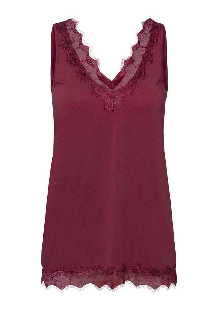 De Billie lace strap v-neck top van Rosemunde is een mouwloze top met kanten details aan de hals. De top heeft een v-hals.