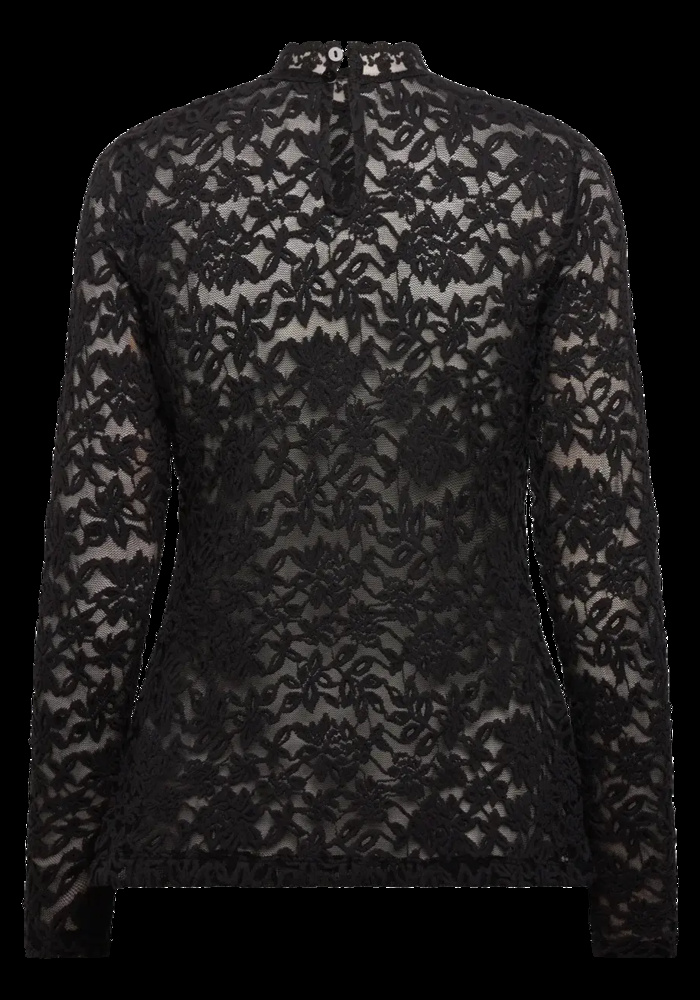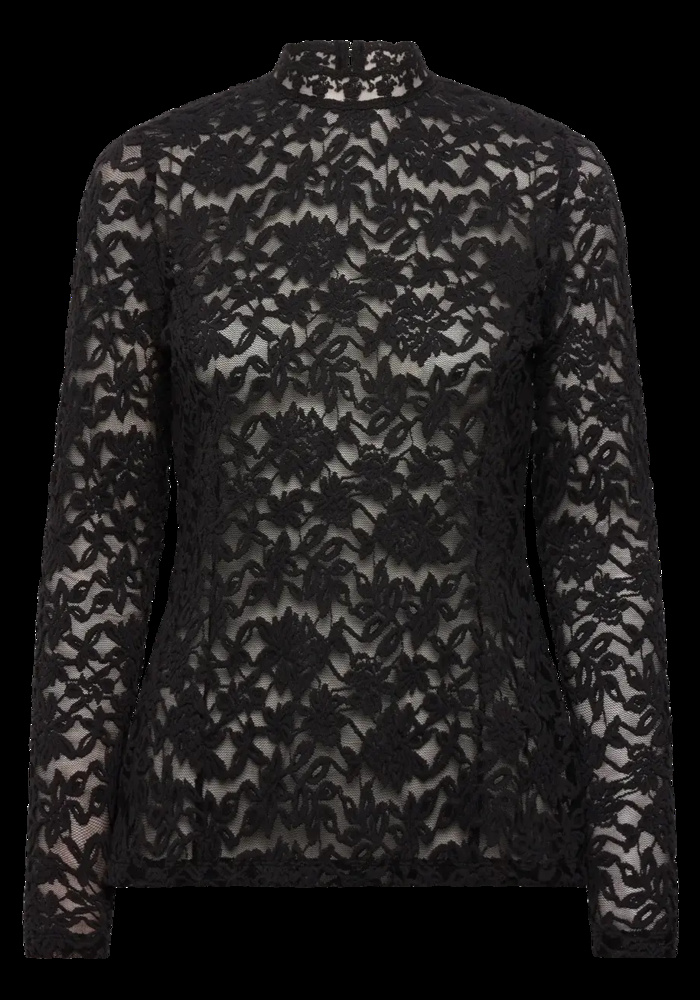 De Dania lace top van Rosemunde is een lange mouwen top met ronde hals. De kanten top is doorschijnend, leuk om te dragen onder een trui of gewoon zo met een bijpassend zwart topje.