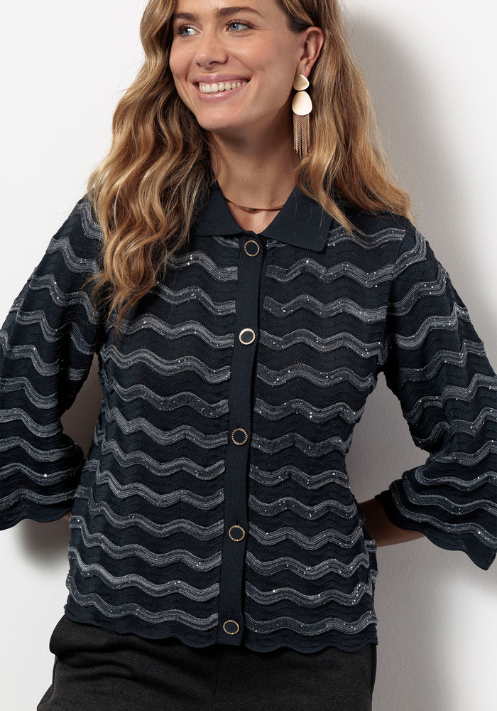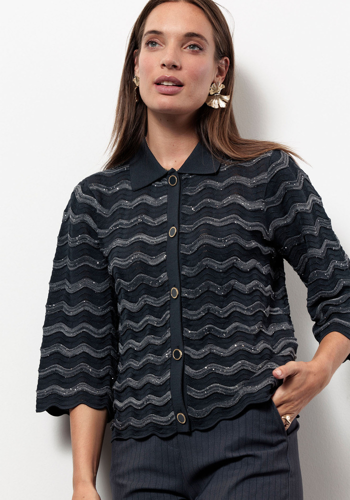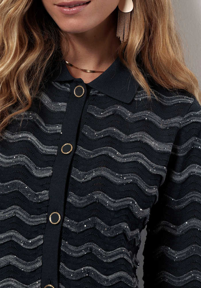 De Jacy sequins cardigan van Studio Anneloes. De elegante ajourstructuur, glinsterende details en vrouwelijke pasvorm maken van dit vest een feestelijke eyecatcher die je ook moeiteloos in je dagelijkse look integreert.