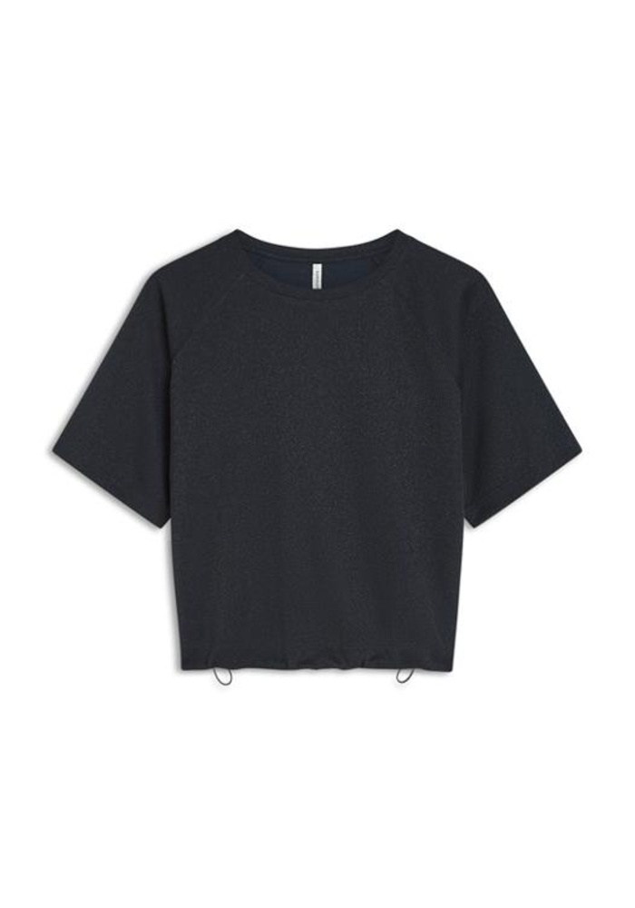 Deze boxy tee van Summum is een wijdvallende top met korte pasvorm. De top heeft een ronde hals en korte mouwen en heeft een subtiele glitter.