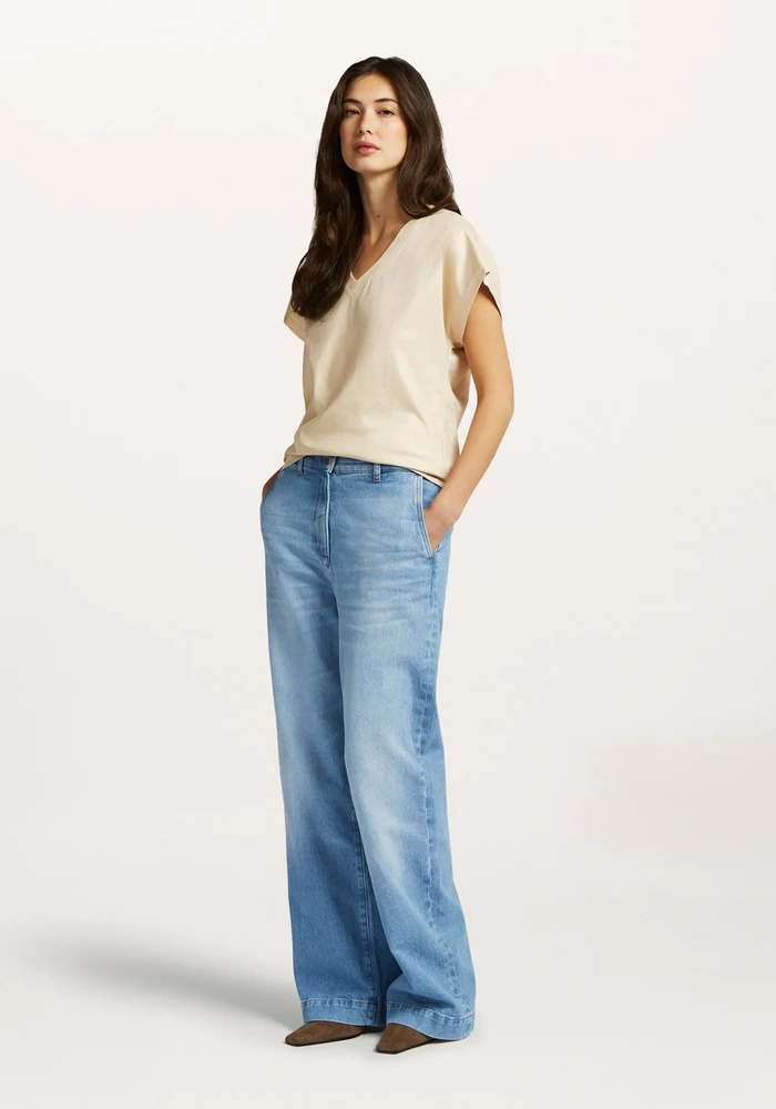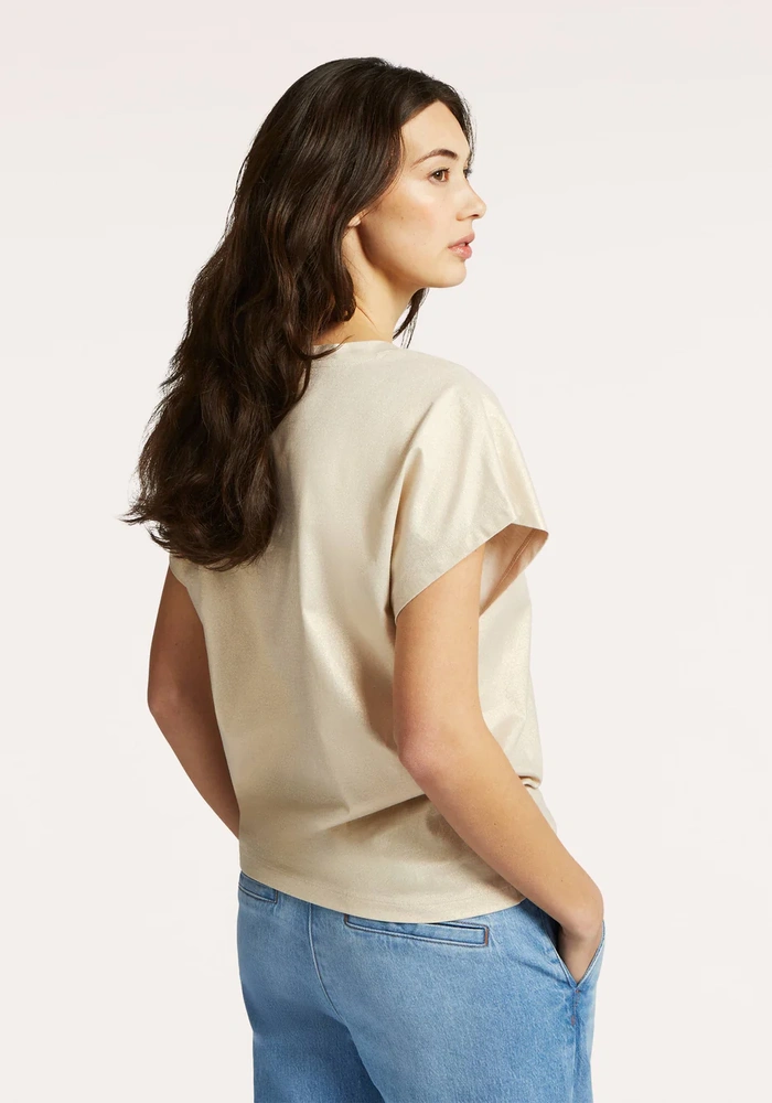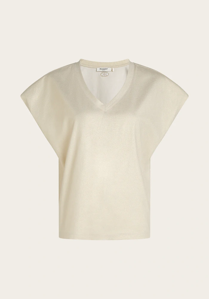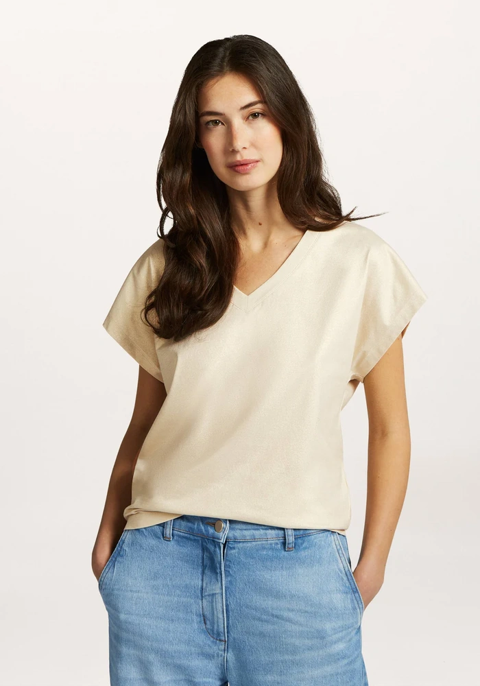 Deze top is uitgevoerd in katoen met een subtiele glanzende stof voor een luxe uitstraling. De V-hals en korte vleermuismouwen geven het model een vrouwelijke en moderne look. Dankzij het veelzijdige ontwerp is de top op twee manieren te dragen, perfect om af te wisselen in stijl.