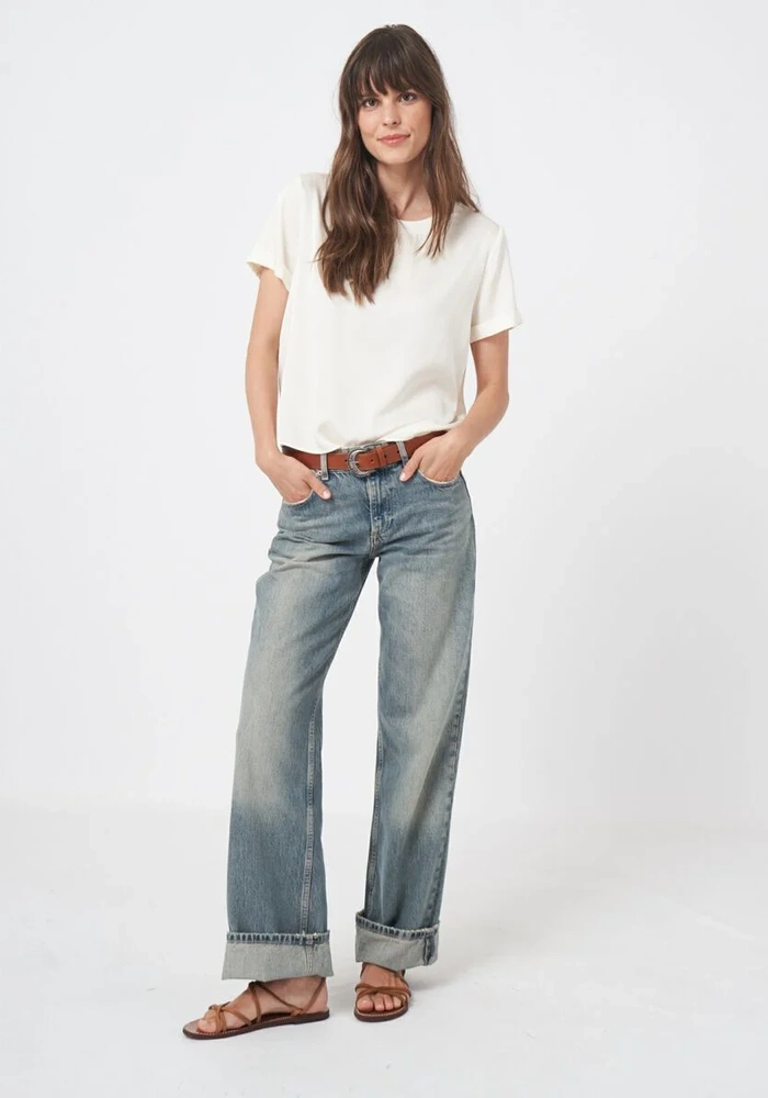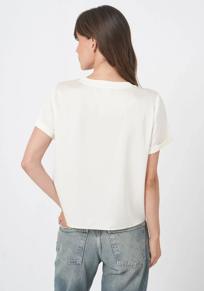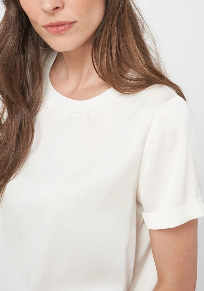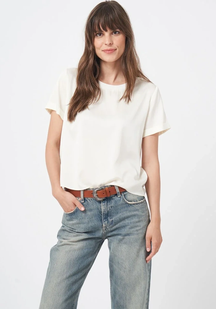 Deze top van Repeat is vervaardigd van soepelvallende, elastische satijnzijde die dankzij de zachte stretchzijde comfortabel aanvoelt en elegant om het lichaam valt. De ronde hals is afgewerkt met een geribde boord, wat zorgt voor een subtiel sportieve touch.