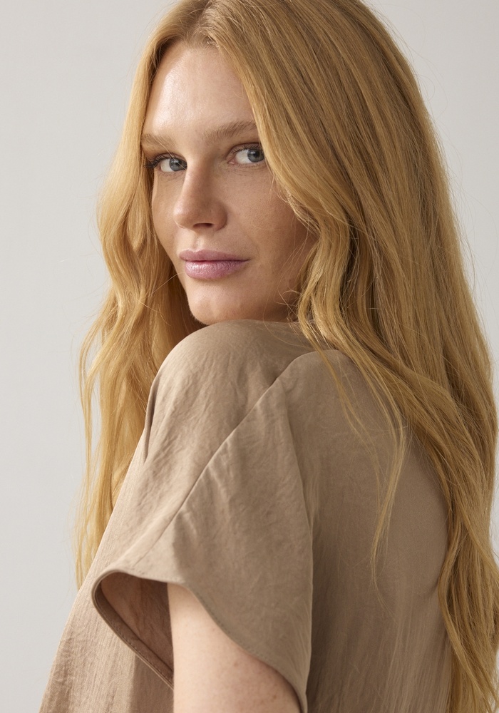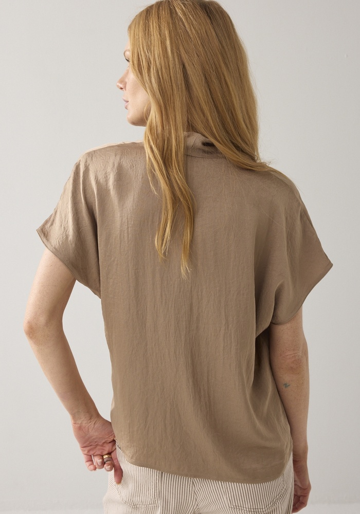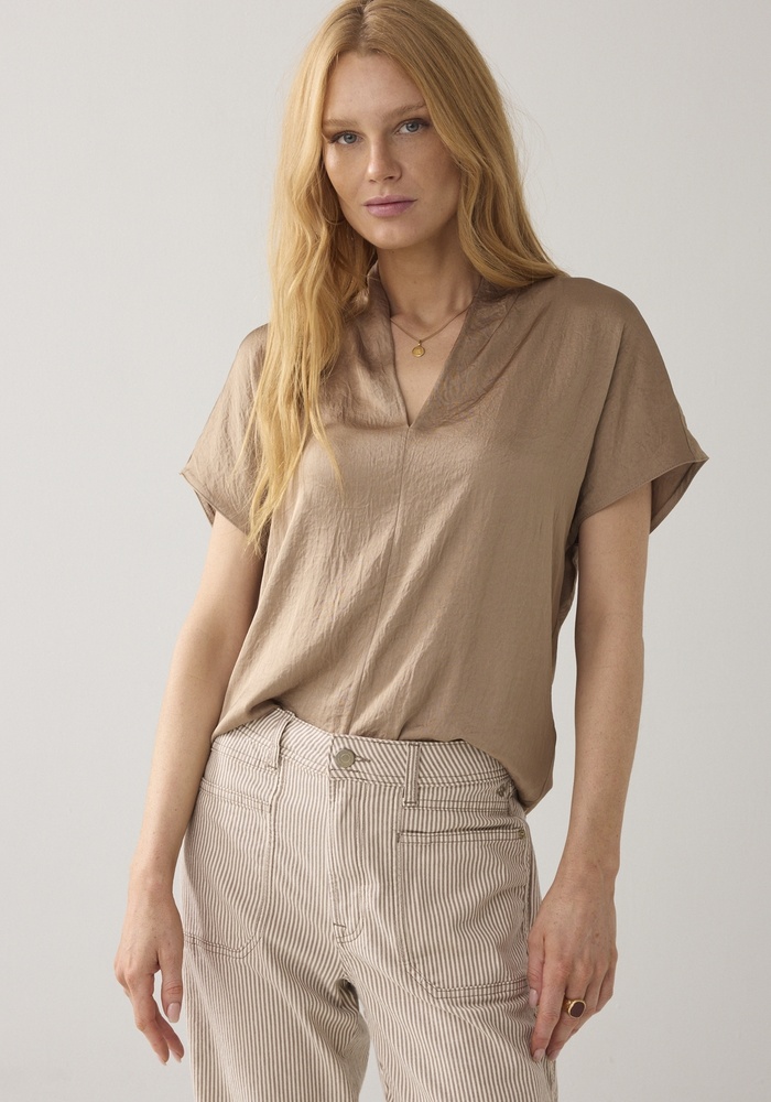 De Short Sleeves Top van Summum in khaki is een soepelvallende en elegante top met een flatterende V-hals en subtiele naad middenvoor. De glanzende stof en het kapmouwtje geven een vrouwelijke en stijlvolle touch, perfect voor zowel casual als nette looks.