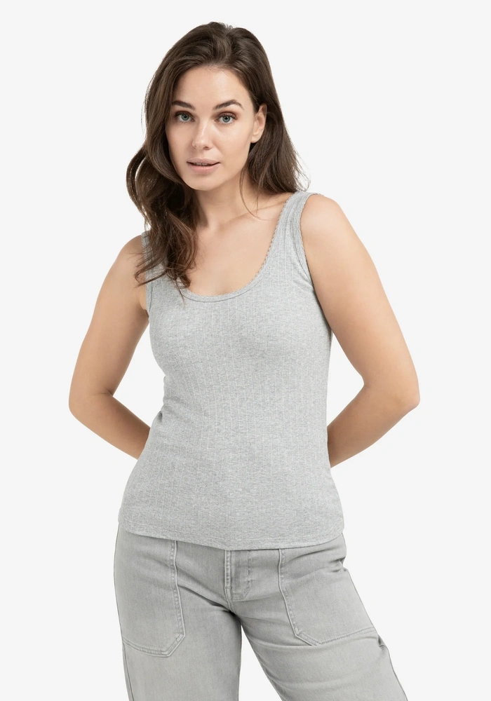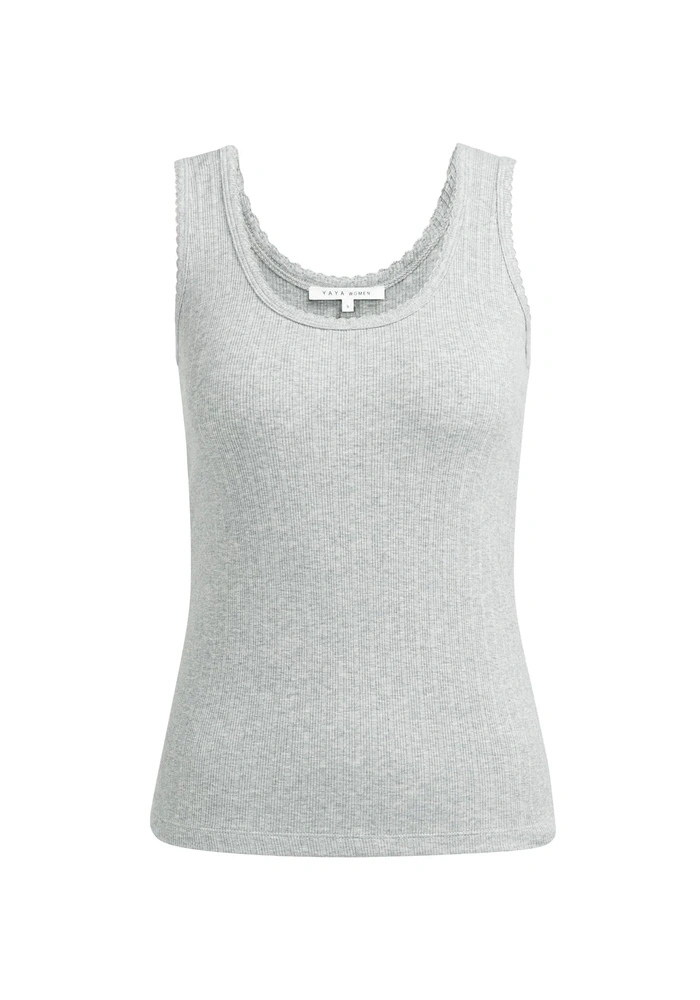 Dit singlet van Yaya is vervaardigd van een zachte, elastische ribstof en heeft een aangesloten pasvorm. De halslijn en armsgaten zijn afgewerkt met een subtiel golvend randje, wat zorgt voor een vrouwelijke en elegante touch. Ideaal om los te dragen op warme dagen of als comfortabele basis onder een blouse of vest.