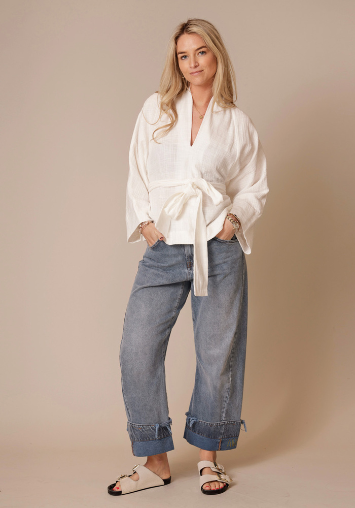 De Alaya top van Sea Me Happy is een elegante top. De top heeft wijde mouwen, een v-hals en heeft een ceintuur in de taille.