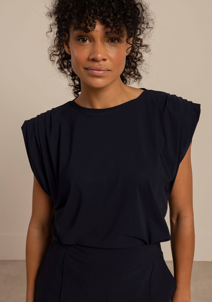 De Leona top van Studio Anneloes is een stijlvolle basic met een verfijnde uitstraling. De regular fit en subtiele plooien zorgen voor een vrouwelijk silhouet, terwijl de Italiaanse Medium Travelstof zorgt voor optimaal draagcomfort en een verzorgde look, de hele dag door.