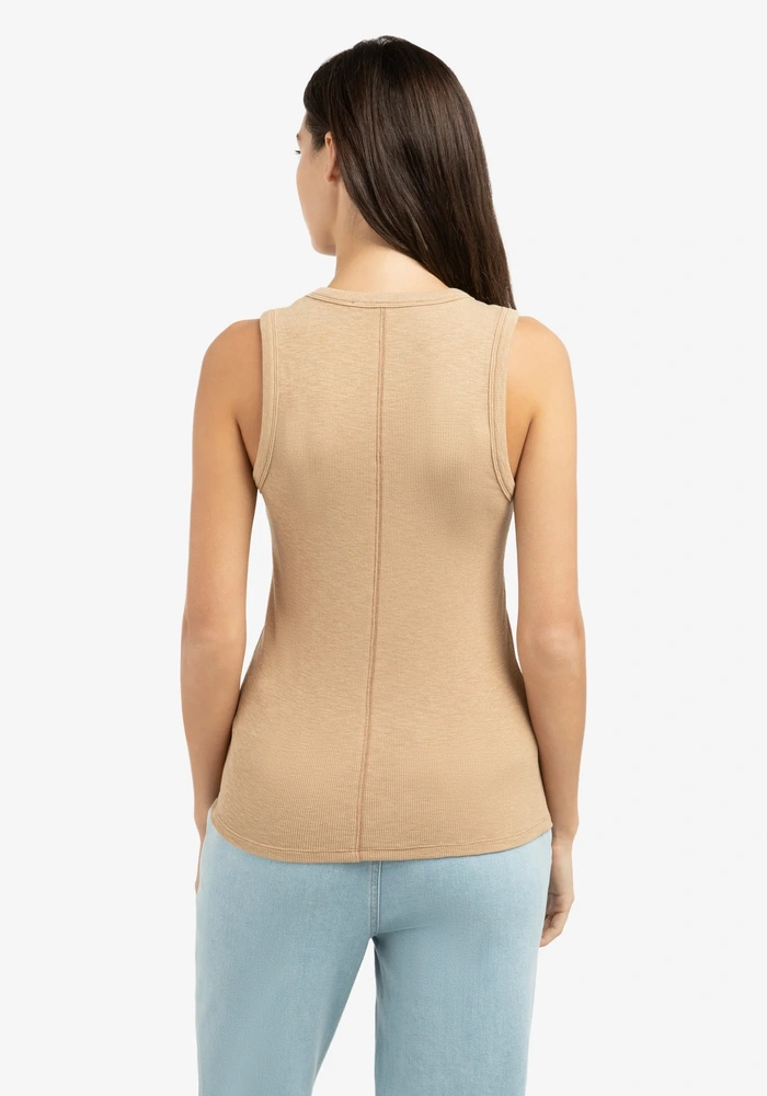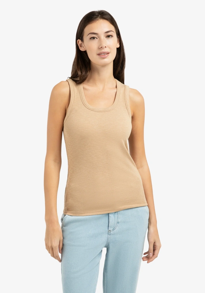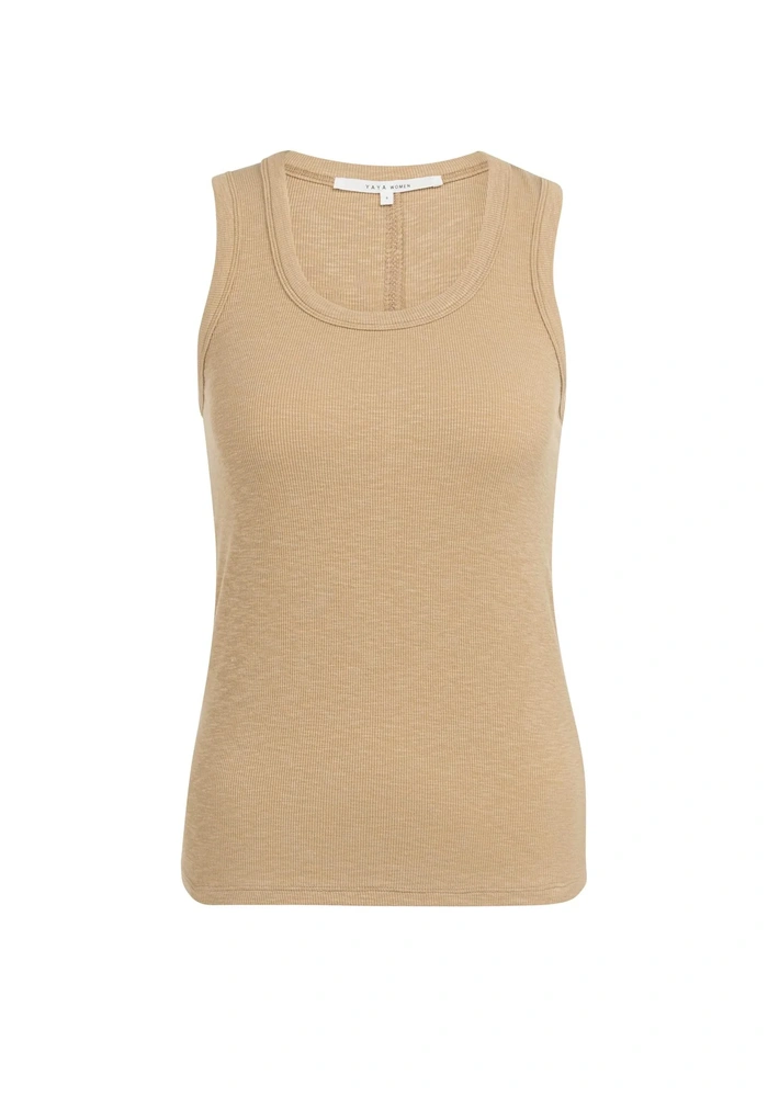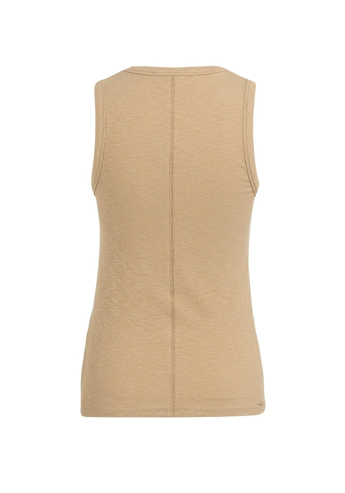 Dit zachte singlet is vervaardigd van geribd materiaal en heeft een aansluitende pasvorm voor een comfortabele look. De ronde hals en brede schouderbanden geven een tijdloze uitstraling, terwijl de naad aan de achterzijde zorgt voor een subtiel detail. Ideaal om los te dragen of als basislaag onder een blouse of vest.