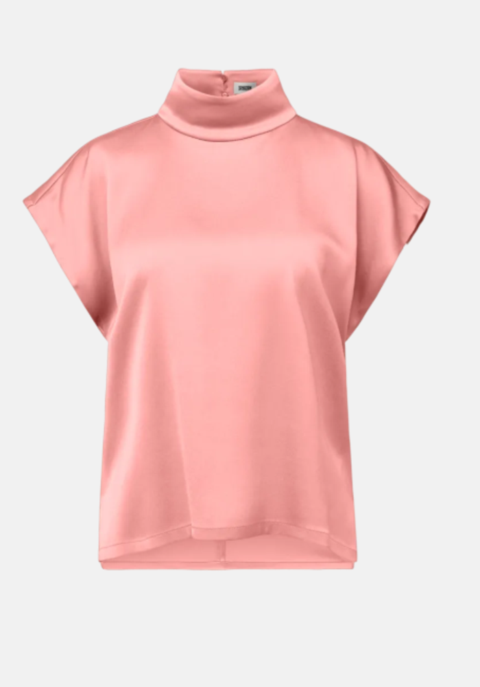 De Alaria top heeft een relaxte pasvorm met een moderne H-lijn en korte, oversized mouwen. De soepelvallende satijnstof en opstaande kraag zorgen voor een elegante, verfijnde uitstraling.