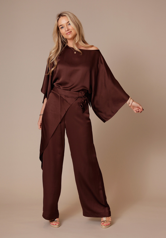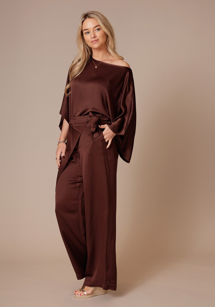 De heavy Silk top van Summum is soepelvallend. De top heeft een boothals, rechte kimonomouwen en een boxy lengte met kleine splitjes aan de zijkant.
