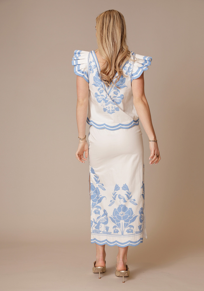 De Vittore top van Scarlett Poppies viert ambachtelijk vakmanschap met verfijnde, handgemaakte details. Speelse ruchesmouwen en verfijnd Frans knoopborduurwerk geven deze elegante silhouet een moeiteloze charme.