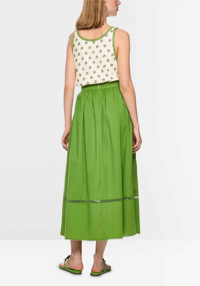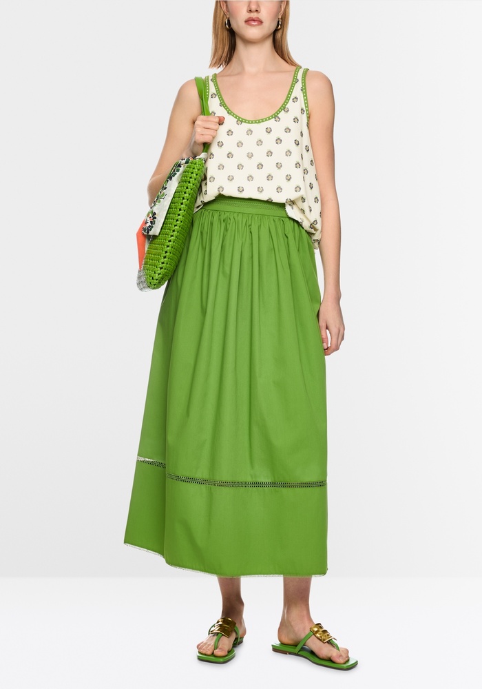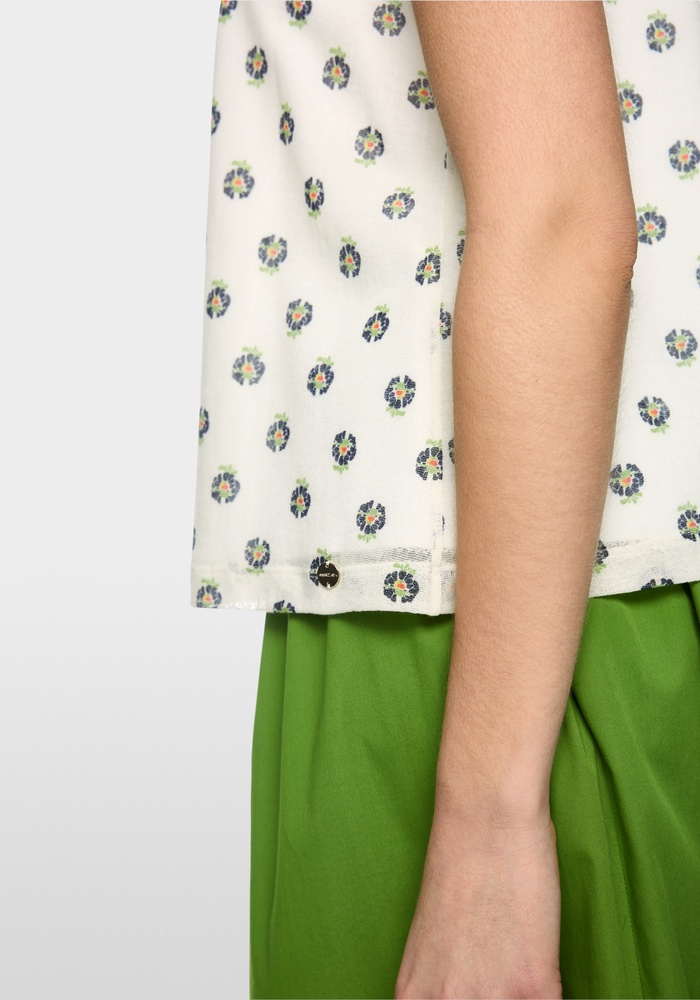 Deze top van Marccain is een losvallende top van stretchkatoen met een zachte binnenkant, voorzien van een print met gestileerde hibiscusbloemen. Contrasterende boorden aan de ronde hals en de armsgaten zorgen voor een modieuze touch. Het model is ‘Knitted in Germany’: de garens worden gebreid op ultramoderne machines en de verdere afwerking van de stof vindt plaats in Duitsland.