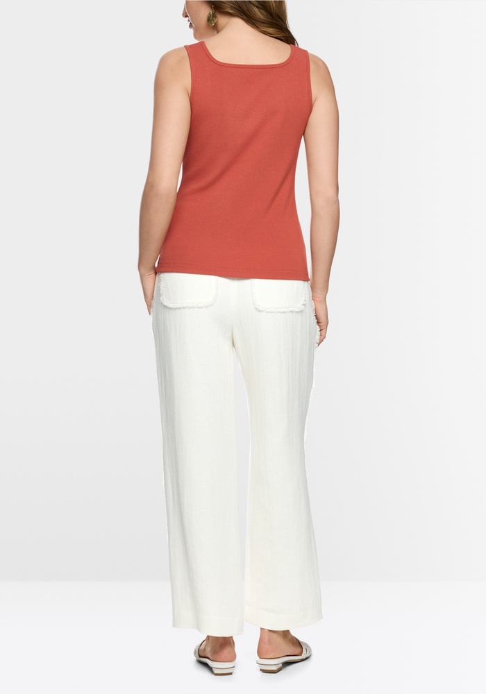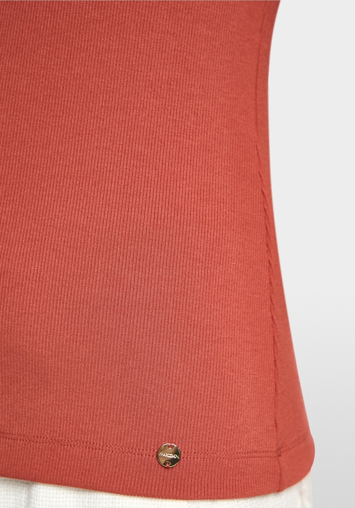 Smal gesneden top van Marccain van zachte, rekbare modalstof met ribstructuur. Voorzien van brede bandjes en een subtiel logo-hangertje. Een veelzijdige basic, ideaal voor dagelijks gebruik en in laagjes.