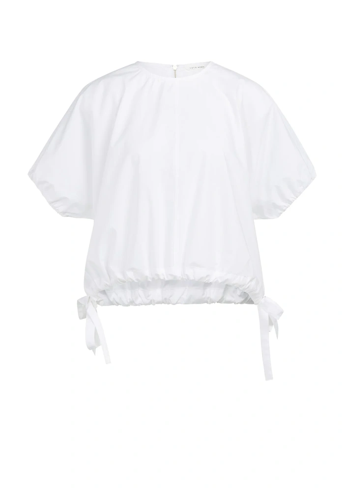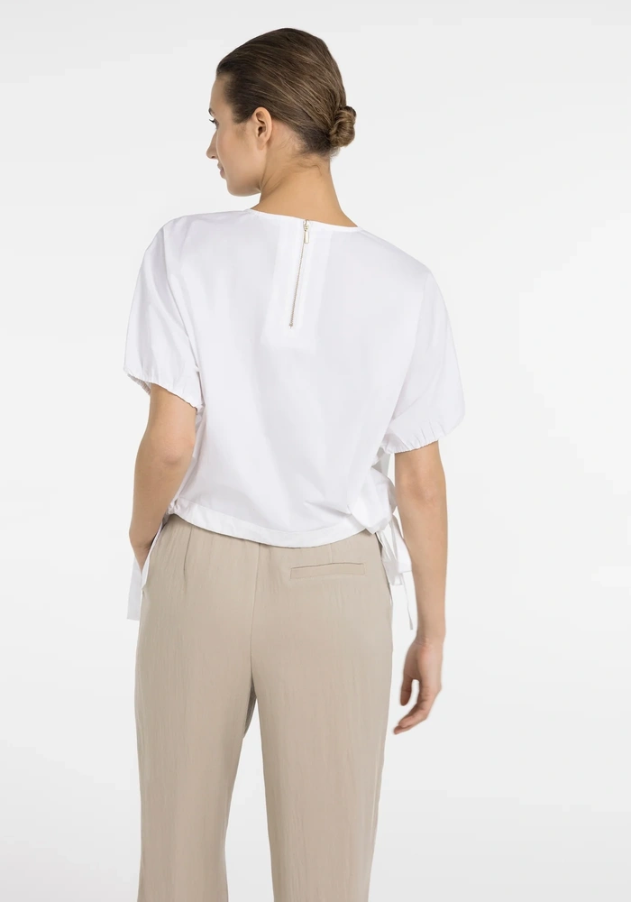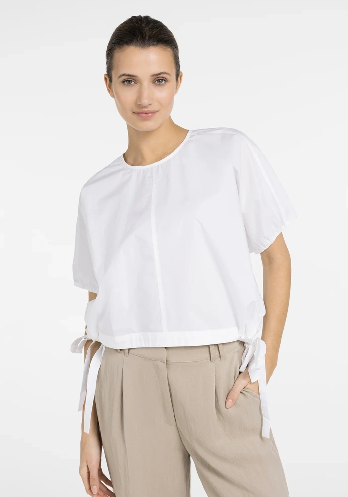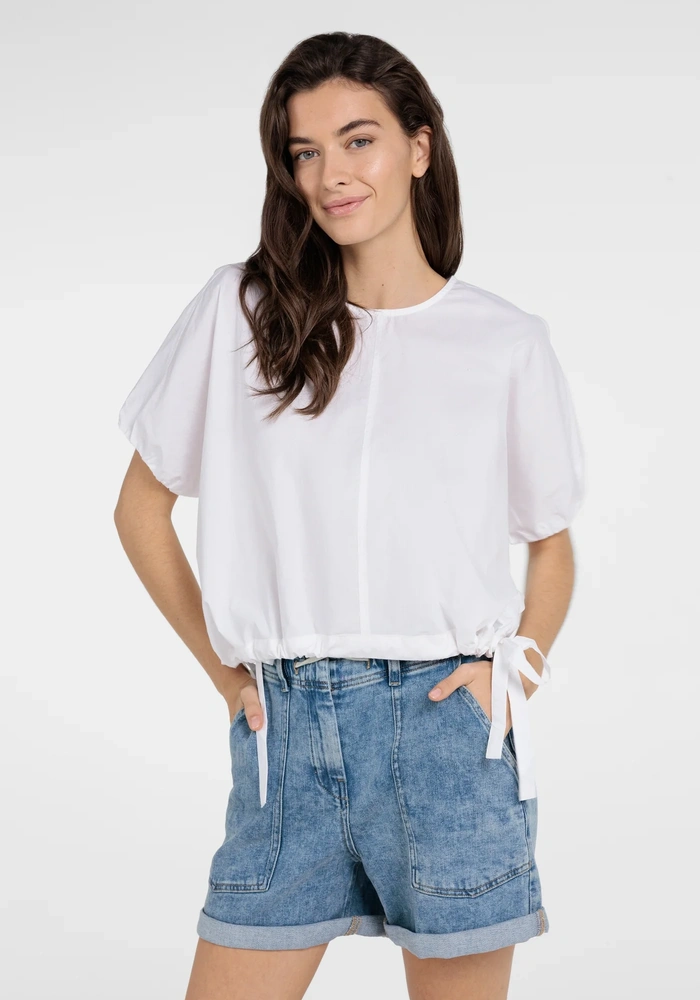 Boxy top van Yaya met ronde hals, korte pofmouwen en oversized pasvorm. Kortere lengte met verstelbare strikkoorden in de taille voor een subtiele aanpassing. Lichte, luchtige look voor een moderne, speelse en casual stijl.