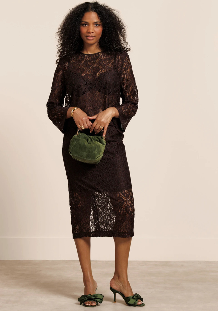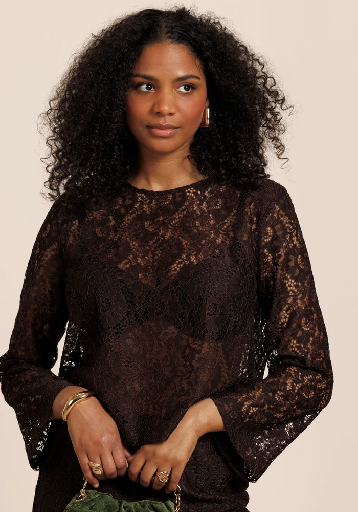 Studio Anneloes Amaya Lace Top is een verfijnde en vrouwelijke top in de diepe kleur Espresso met een elegante kanten afwerking. De regular fit, uitlopende mouwen en subtiele schouderpads geven het item een moderne en krachtige uitstraling.
