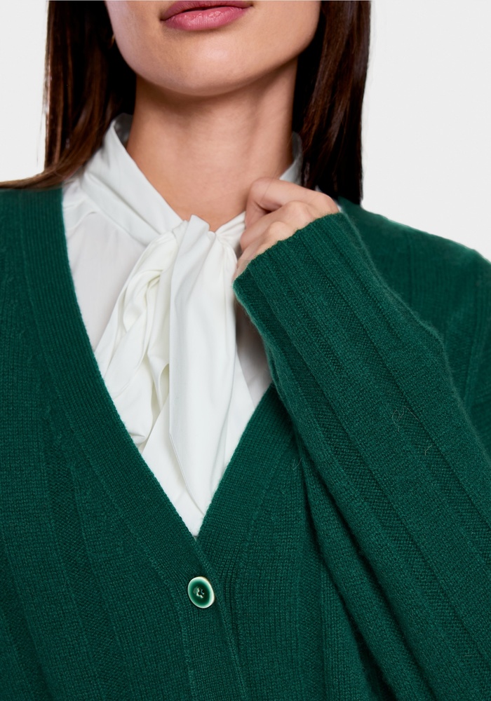 Elegante cardigan van Marccain van zachte scheerwol-kasjmiermix. Brede rib geeft structuur en een moderne look, zijsplitten zorgen voor comfort en een vloeiend silhouet. Duurzaam gecertificeerd met het ‘Rethink Together’-label.