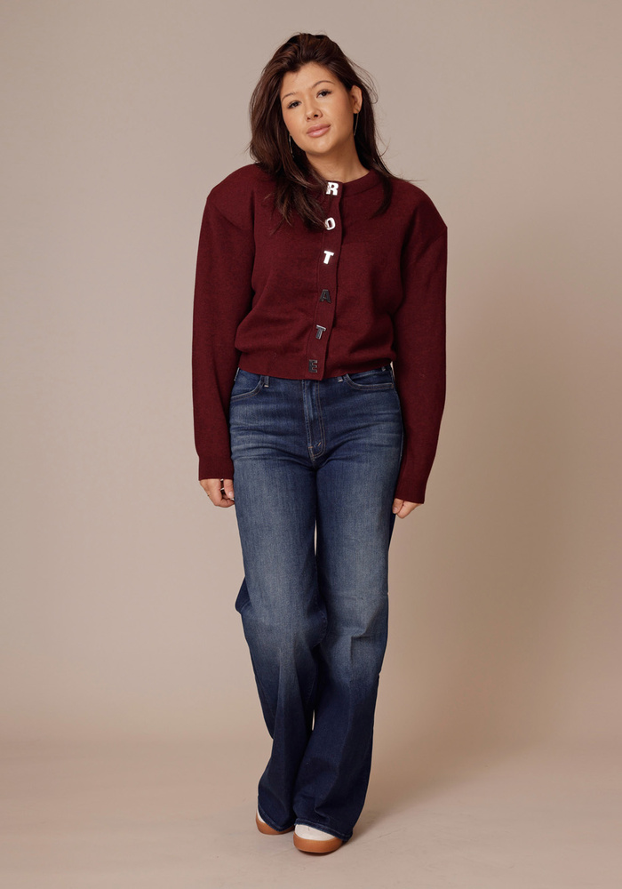 De Firm knit cardigan van Rotate is een vestje met schoudervulling. Het vest heeft aan de voorzijde een drukknoopsluiting met de letters ‘ROTATE’.