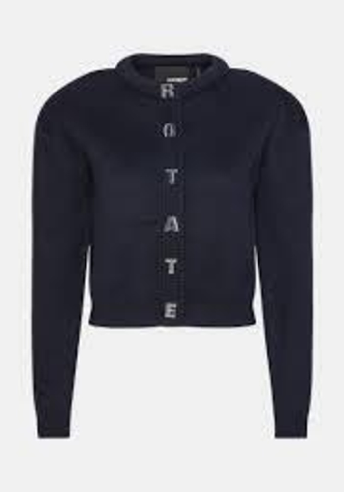 De Firm knit cardigan van Rotate is een vestje met schoudervulling. Het vest heeft aan de voorzijde een drukknoopsluiting met de letters ‘ROTATE’.