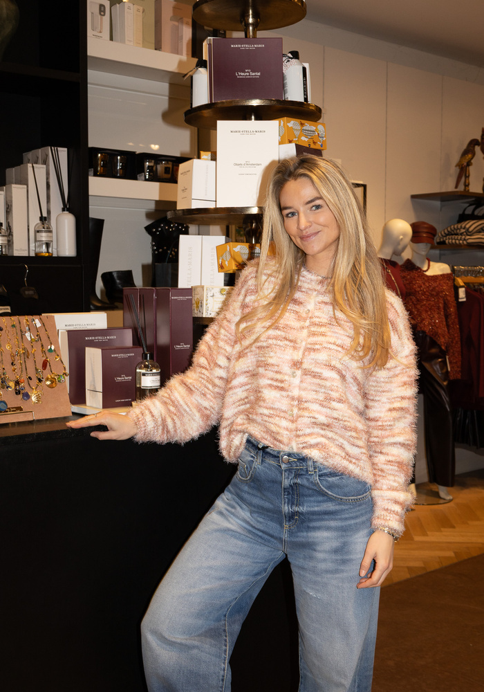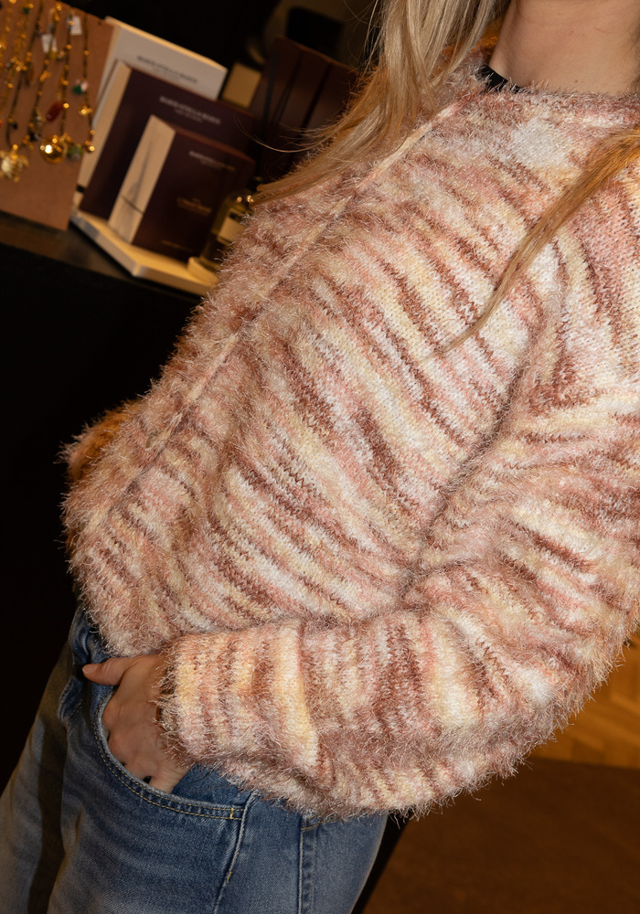 Dit cosy vestje heeft een zachte, harige structuur die meteen een warme en luxe uitstraling geeft. De subtiele mix van roze- en beigetinten zorgt voor een speels gemêleerd effect dat elke outfit een frisse touch geeft.