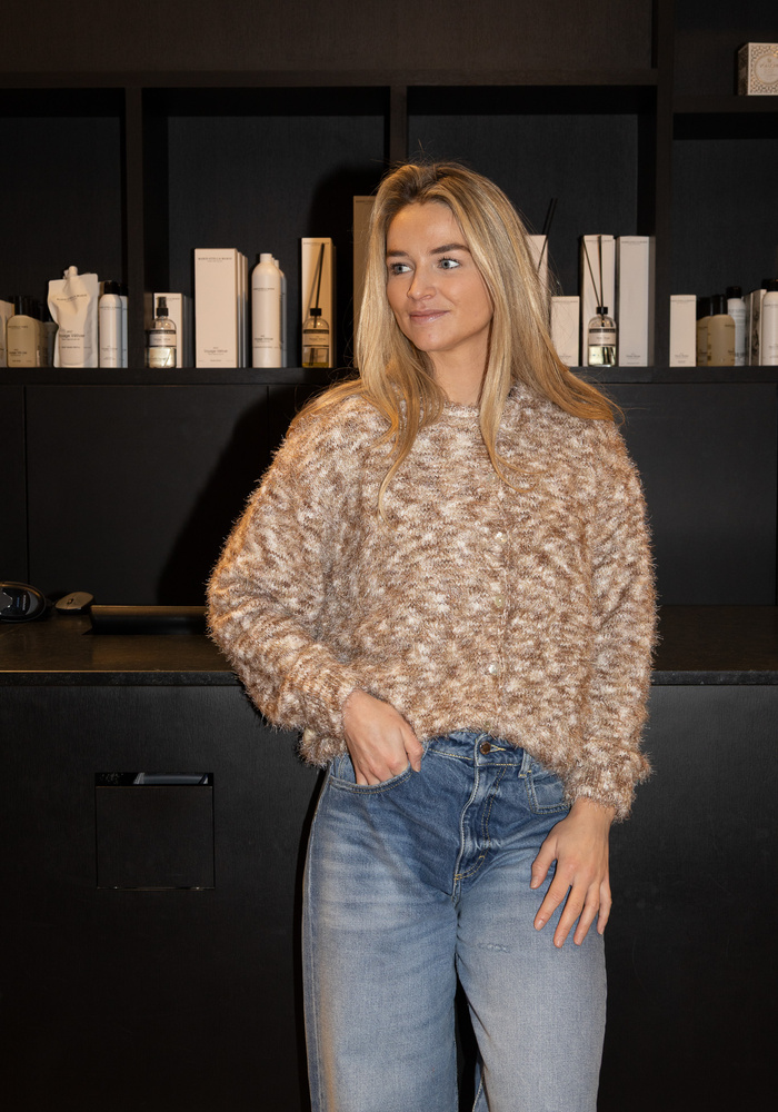 Dit cosy vestje heeft een zachte, harige structuur die meteen een warme en luxe uitstraling geeft. De subtiele mix van roze- en beigetinten zorgt voor een speels gemêleerd effect dat elke outfit een frisse touch geeft.